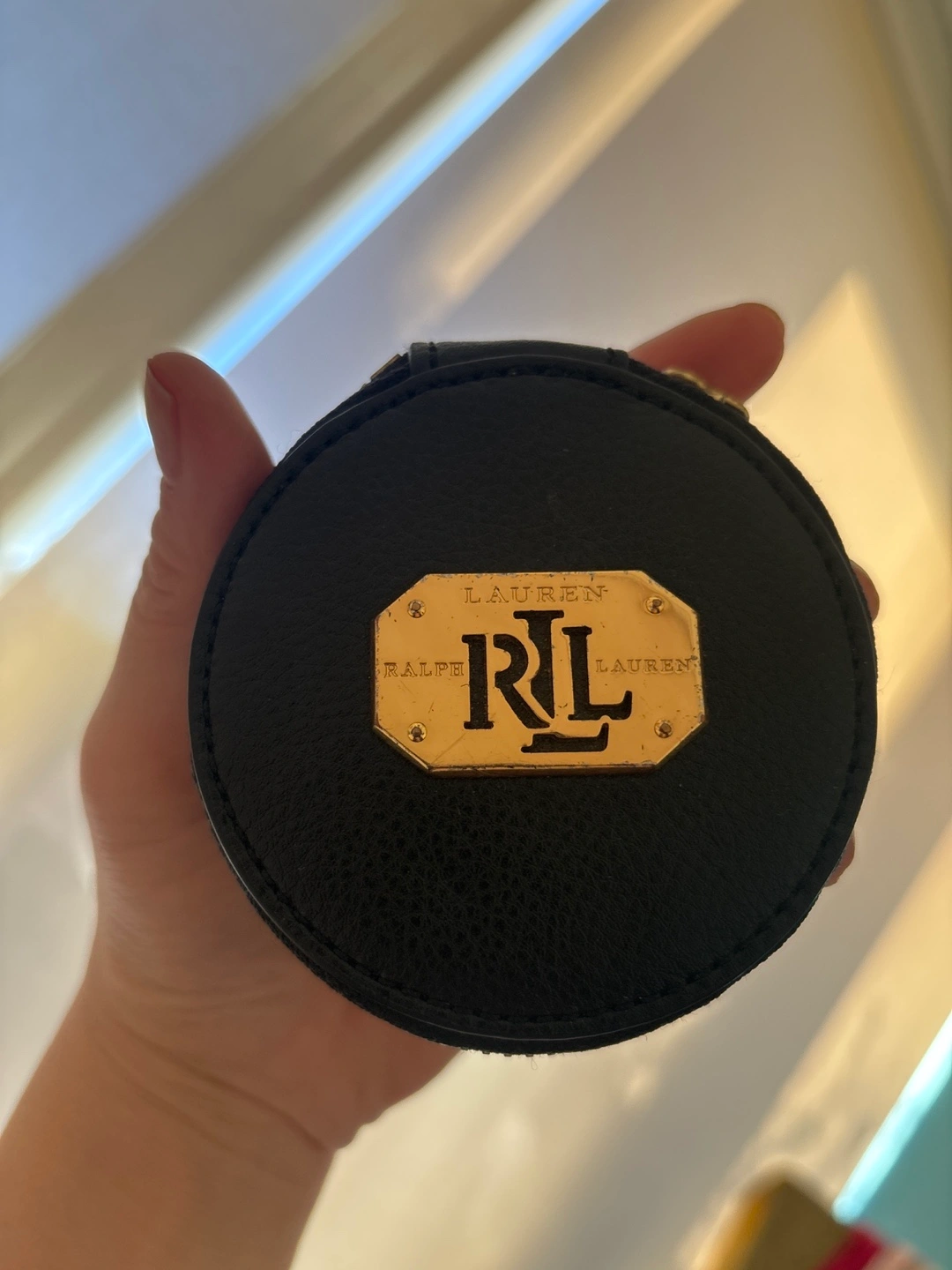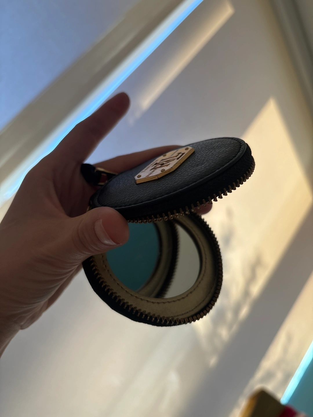 Black leather compact mirror. Small, round, zipper closure. Gold-toned logo plate.
