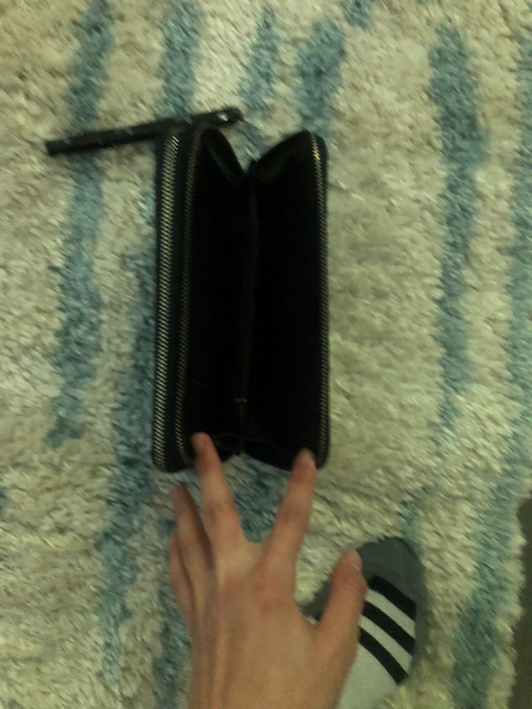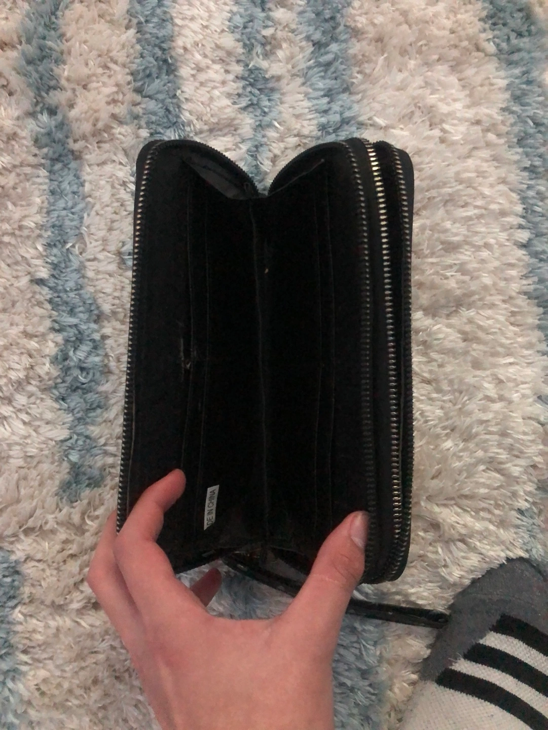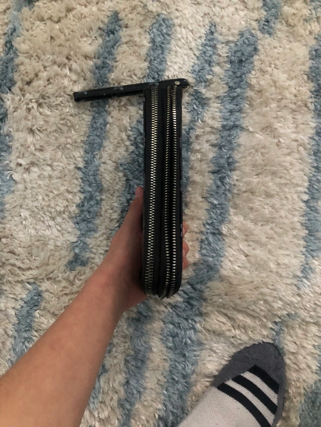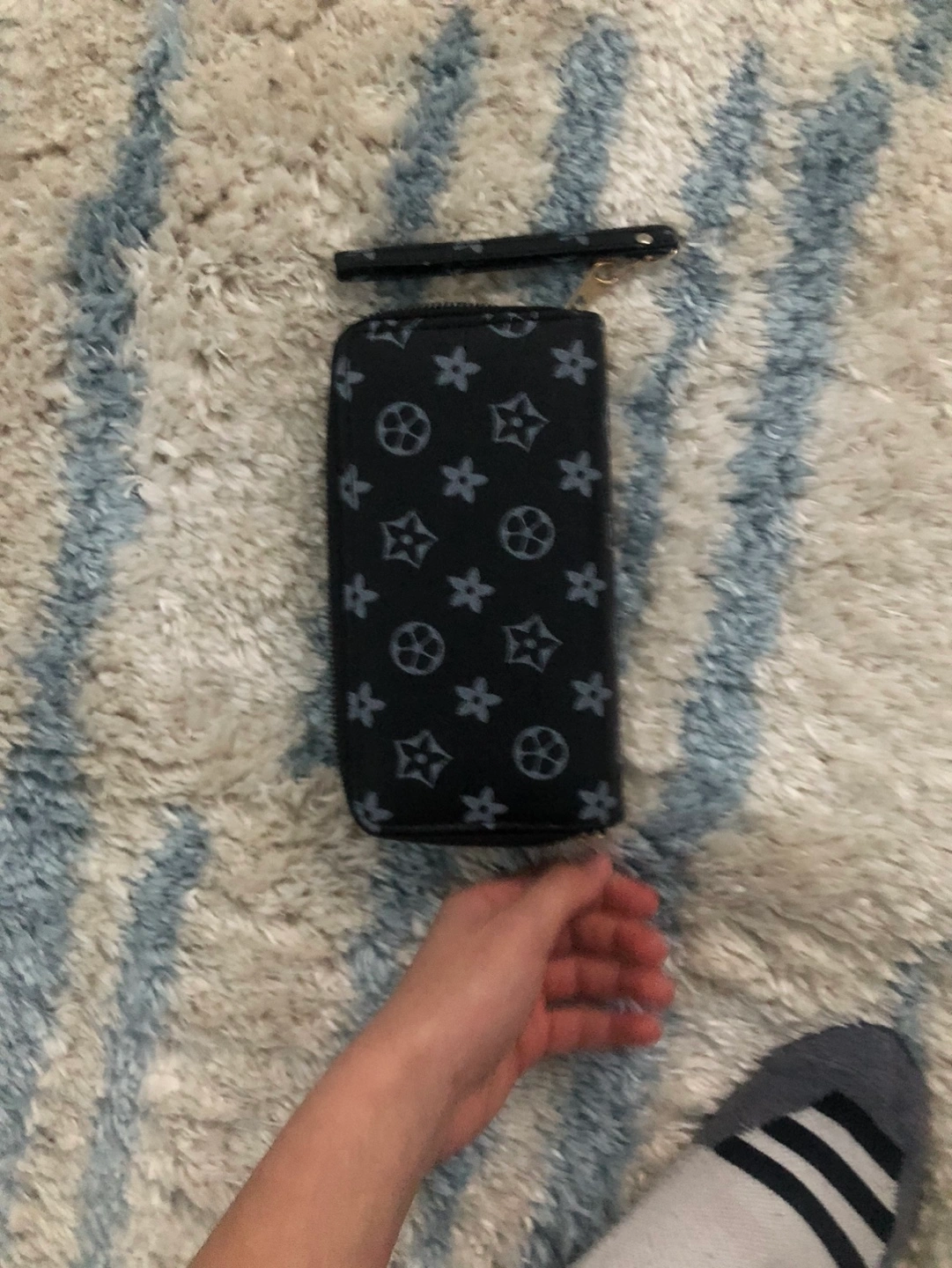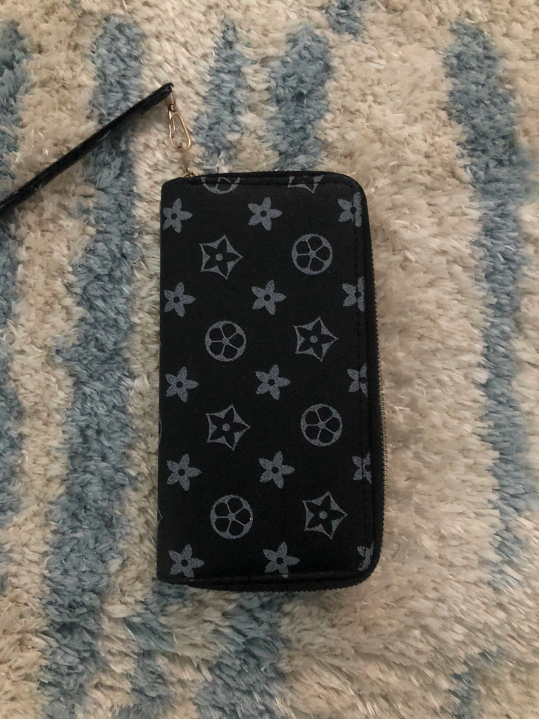 Long black wallet. Double zipper closure. Silver floral and star pattern. Wristlet strap.