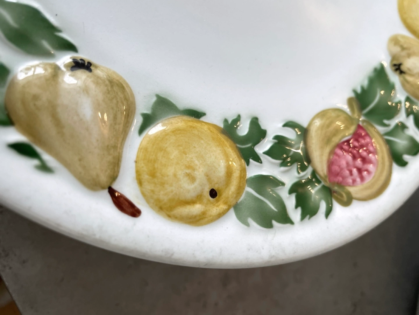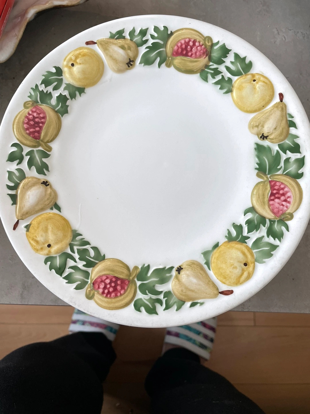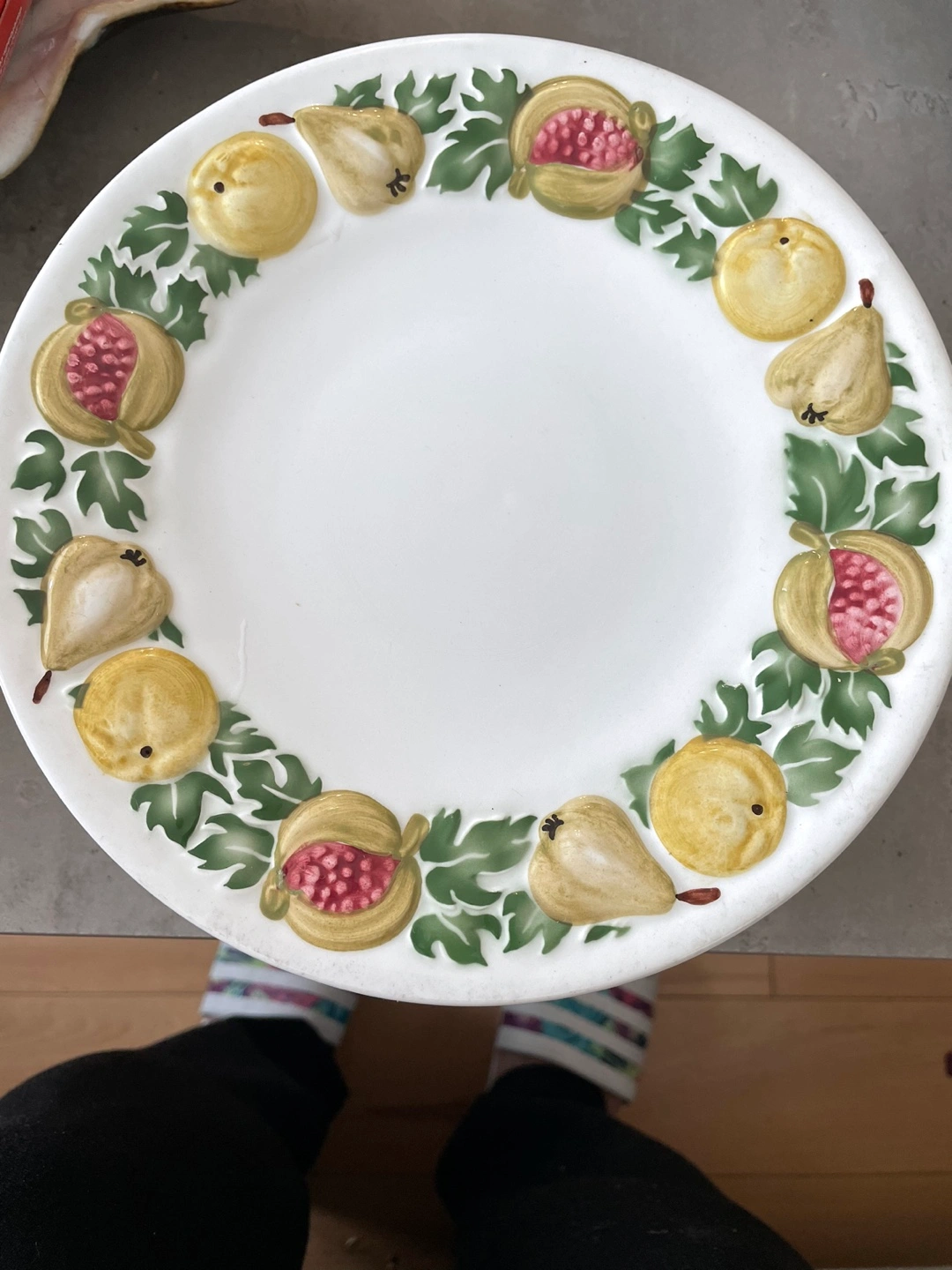 Set of eight vintage plates. Features a border of pears, figs, and apples. White background. Ideal for casual dining or display. Made in Italy Hand painted All for $20 Pick up in richmondhill
