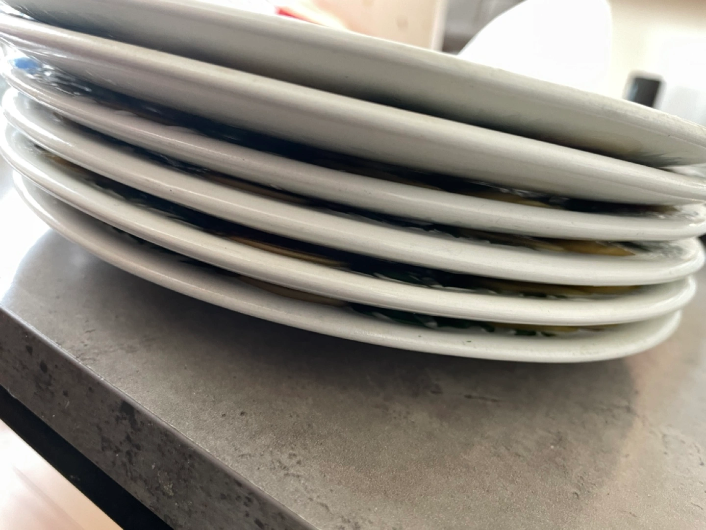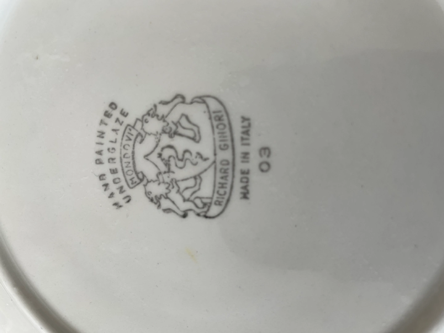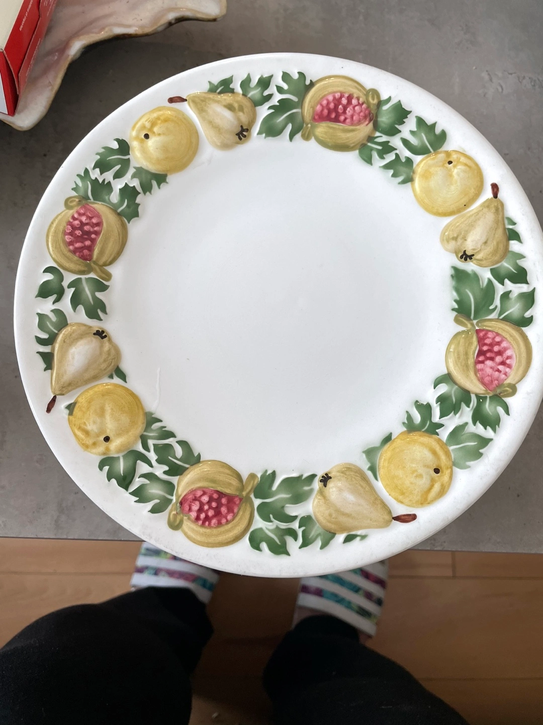 Set of eight vintage plates. Features a border of pears, figs, and apples. White background. Ideal for casual dining or display. Made in Italy Hand painted All for $20 Pick up in richmondhill