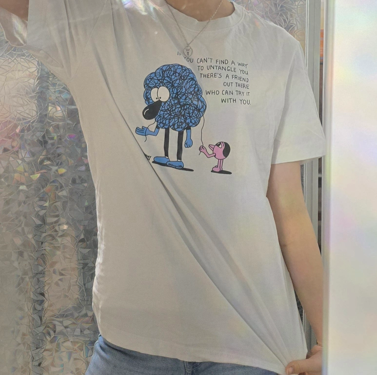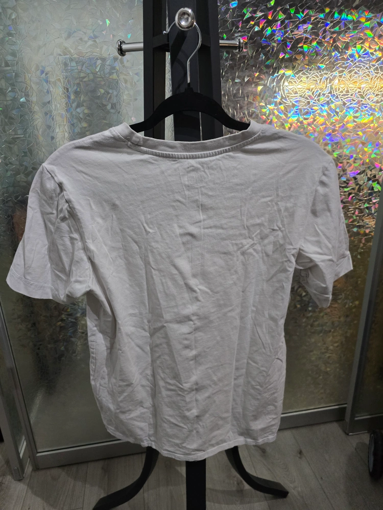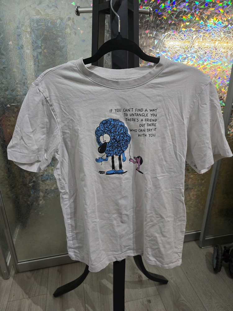 White short-sleeved T-shirt. Features a graphic design and text. Collaboration between HangTen and Jeremy Ville. Price negotiable & open to trades. Delivery possible to most line 1 and line 2 stations.