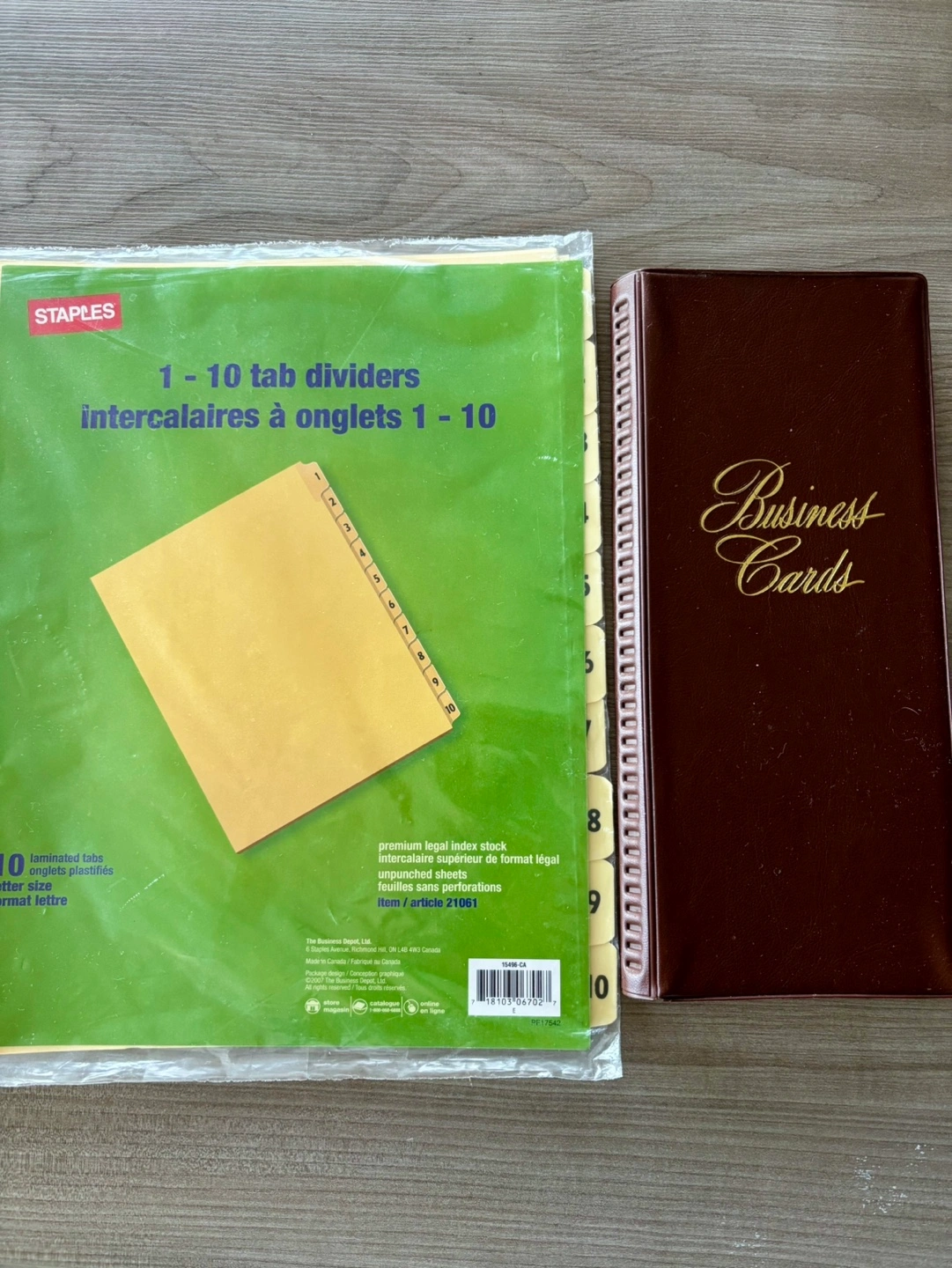 New, unused Staples 1-10 tab dividers. Laminated tabs, letter size. Includes a brown business card holder. Perfect for organizing documents and business cards. Click on my name above and scroll down to see my other listings and pickup locations.