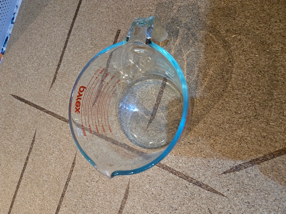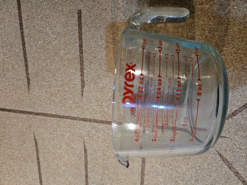 Clear glass measuring cup with handle. Measurements in cups and ounces. Durable and functional kitchen tool. Perfect for baking and cooking.