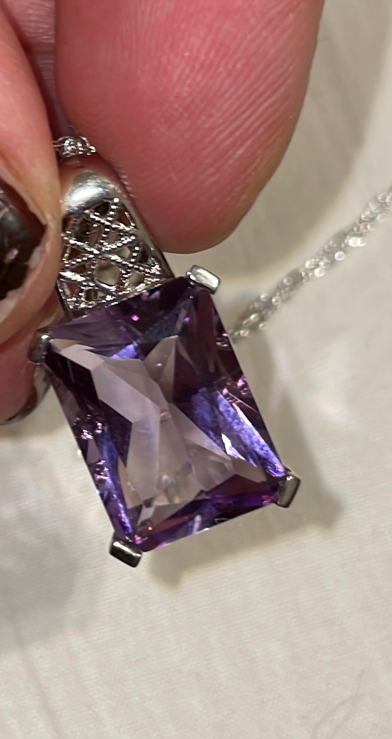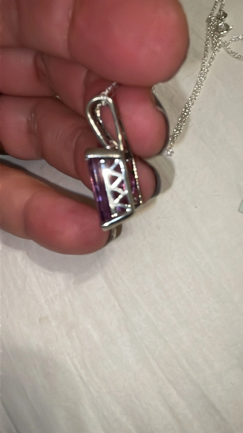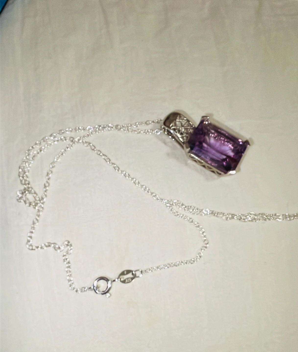 Comes with box. Retail price $125.00 US. Beautiful ornate pendant setting with a Large rectangular cut, Genuine Amethyst. 925 Sterling silver chain necklace Weight 5.2 g BC 1337095 *** last one.