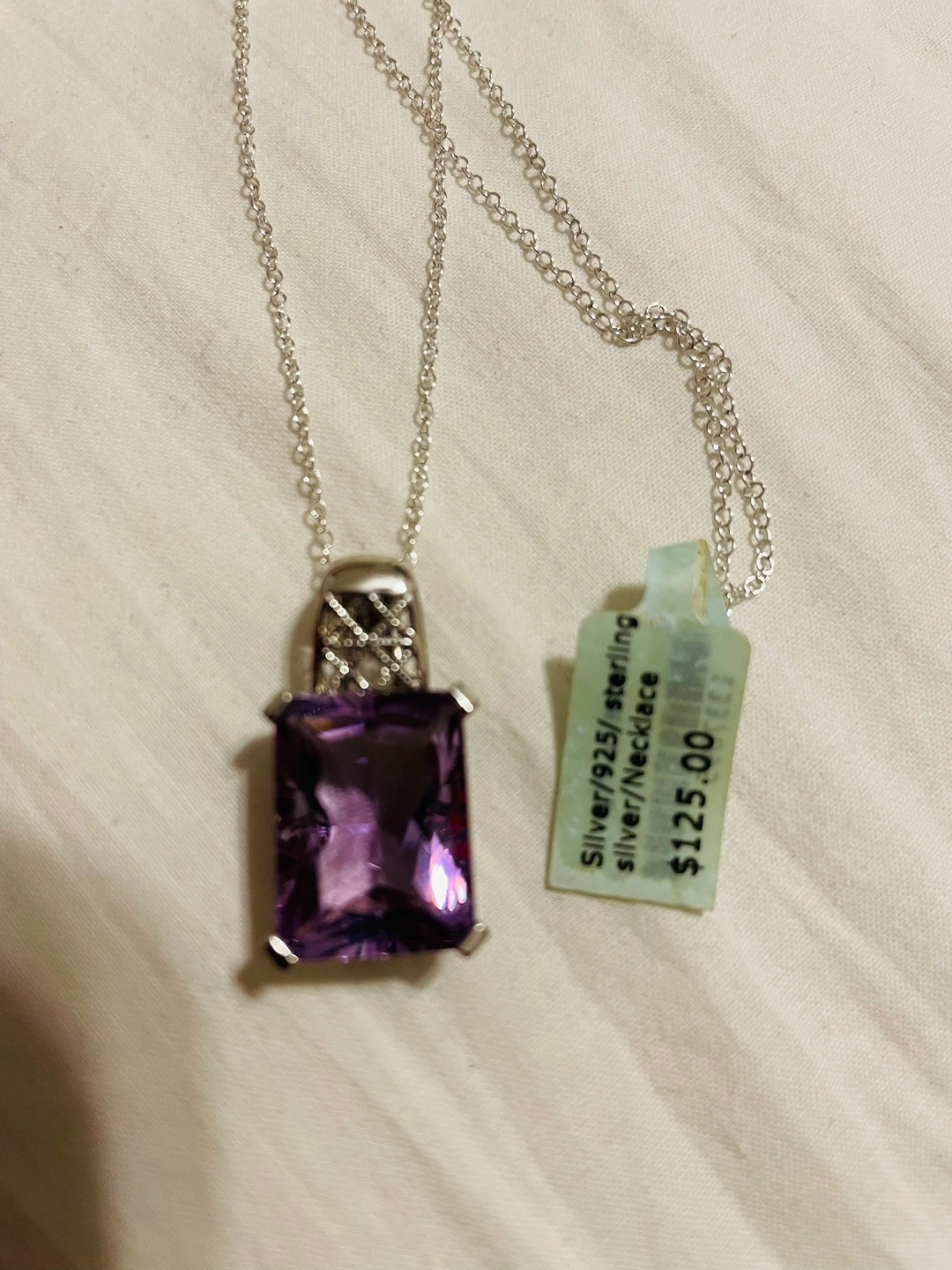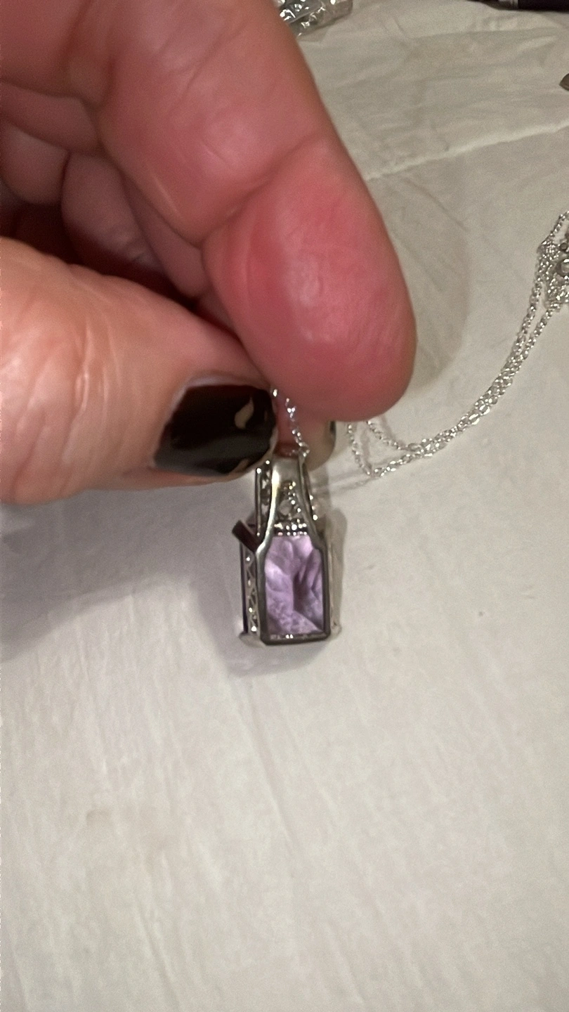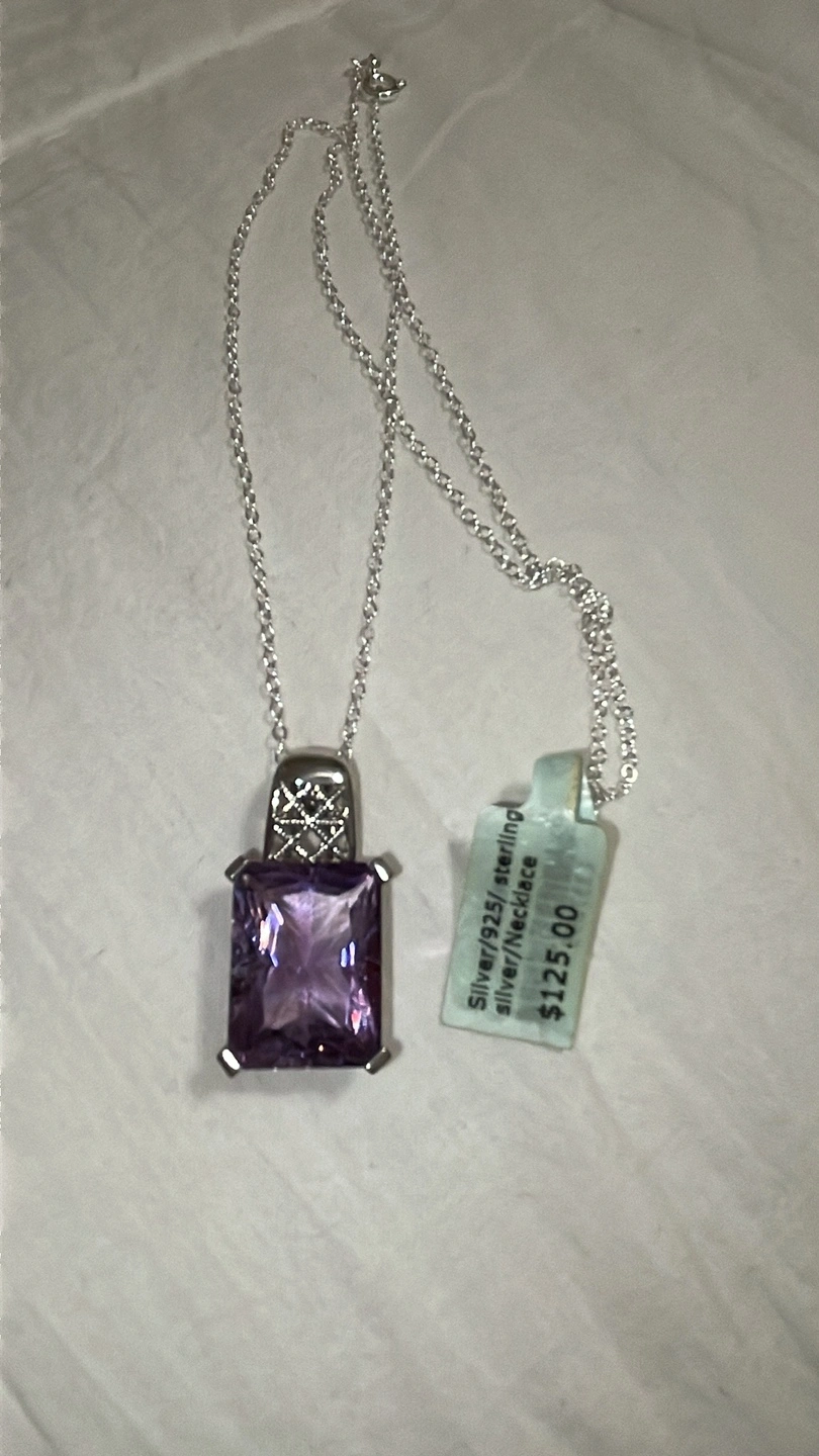 Comes with box. Retail price $125.00 US. Beautiful ornate pendant setting with a Large rectangular cut, Genuine Amethyst. 925 Sterling silver chain necklace Weight 5.2 g BC 1337095 *** last one.