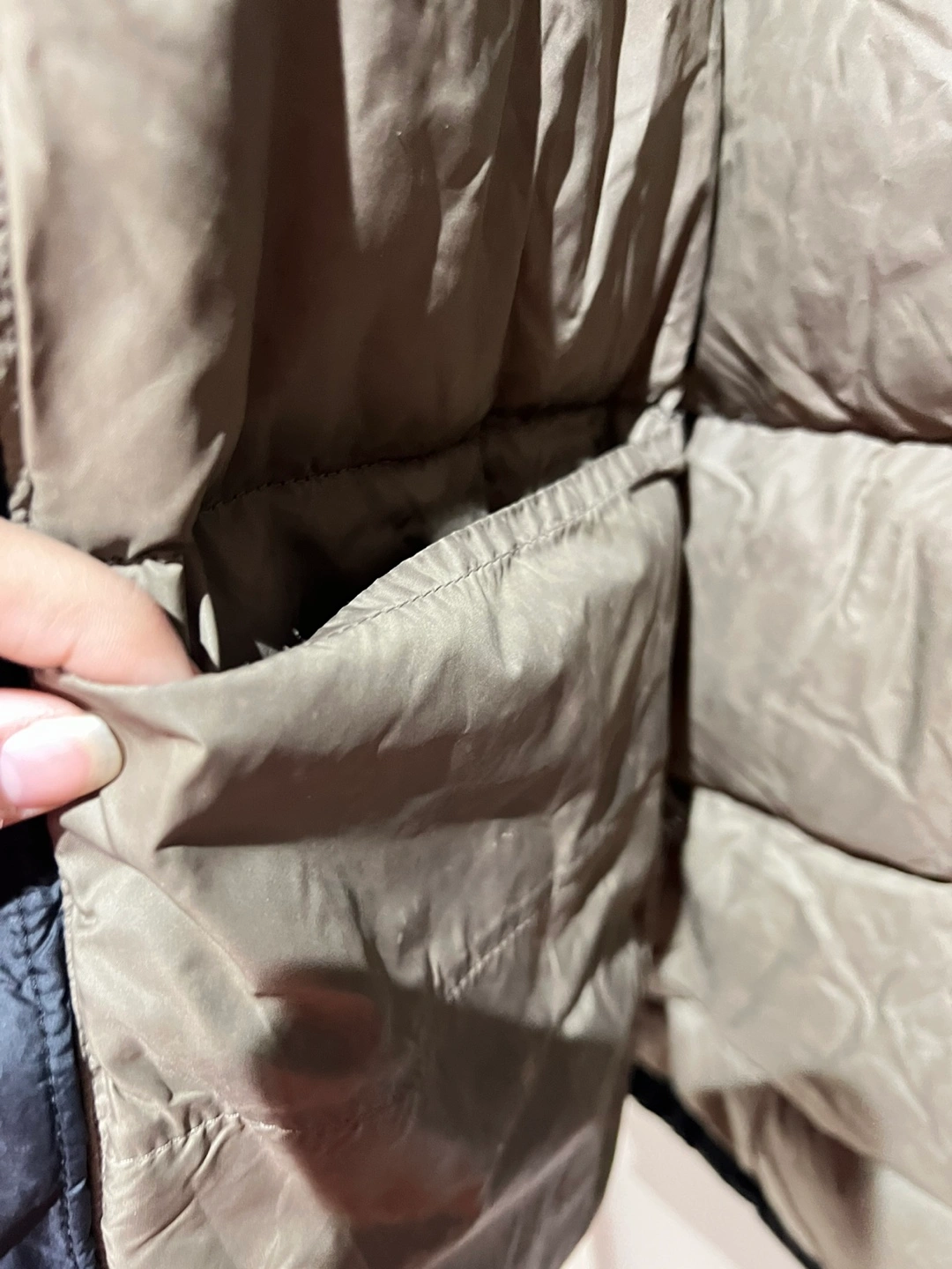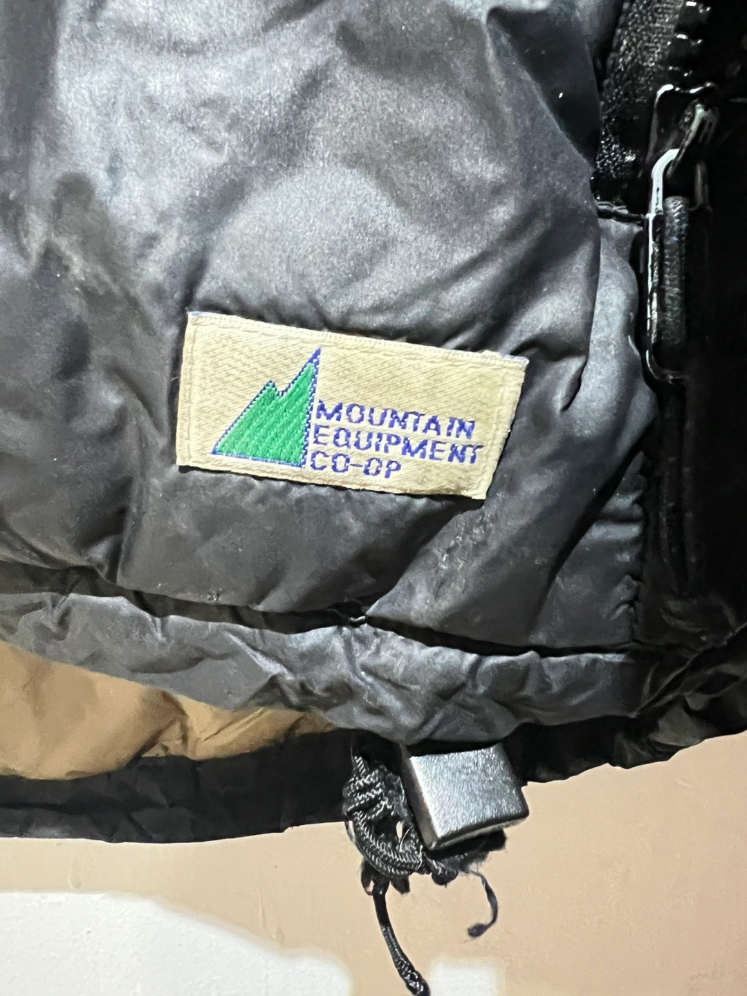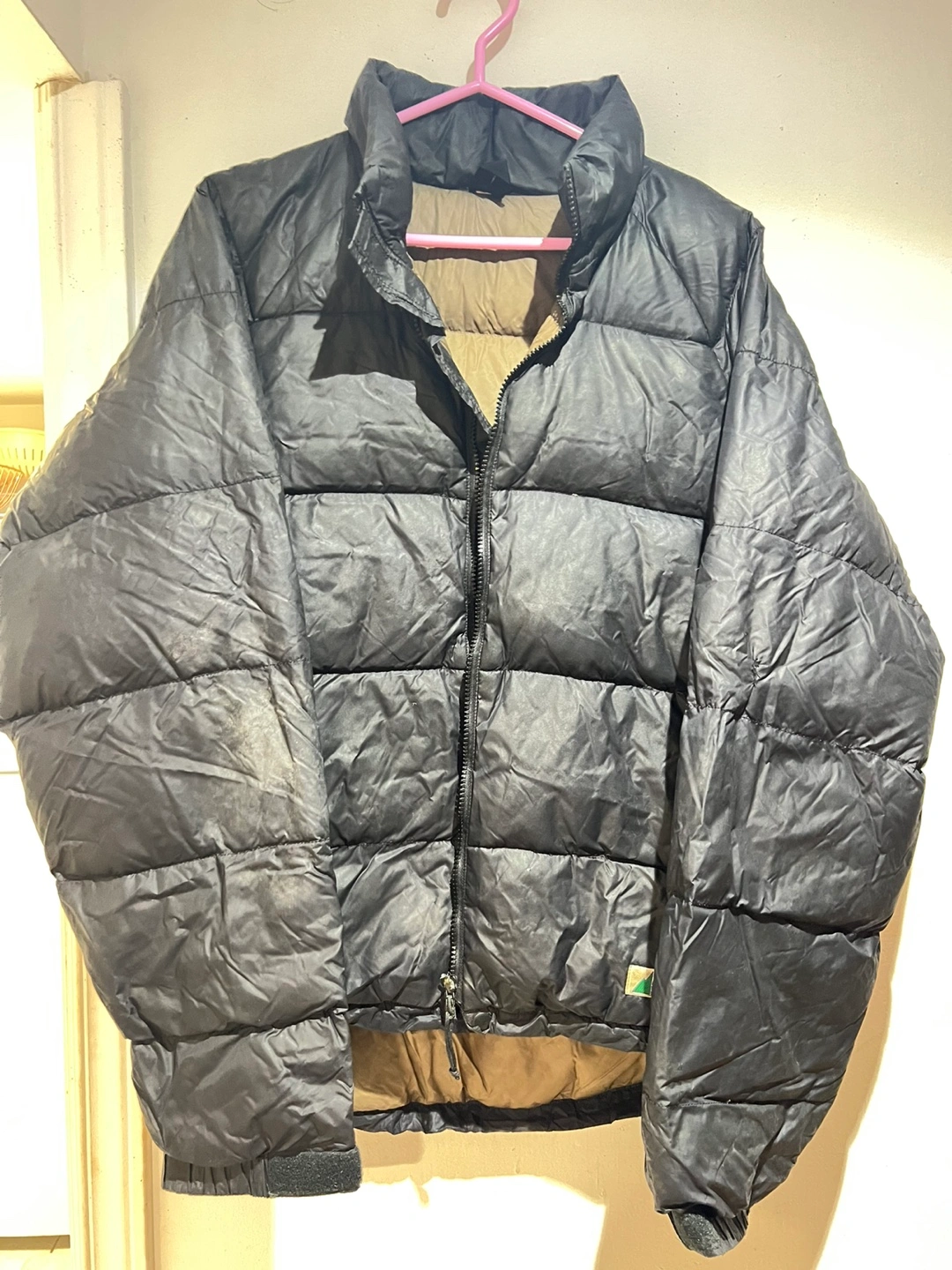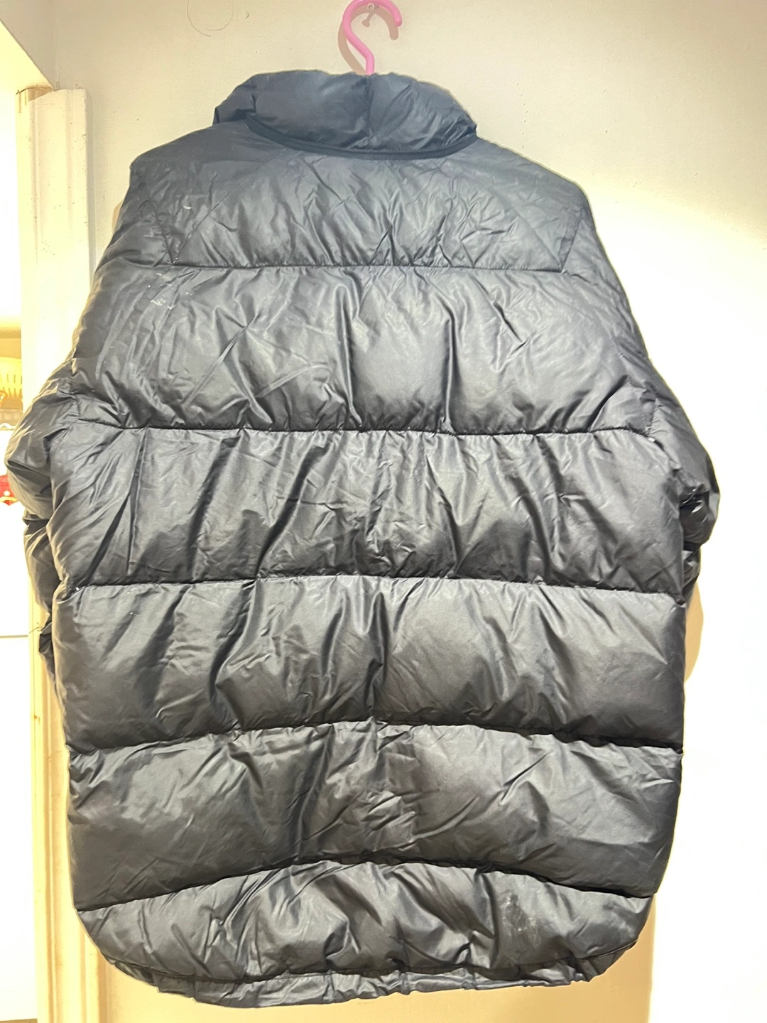 Black puffer jacket. Features a full zip closure and pockets. Warm and comfortable.
