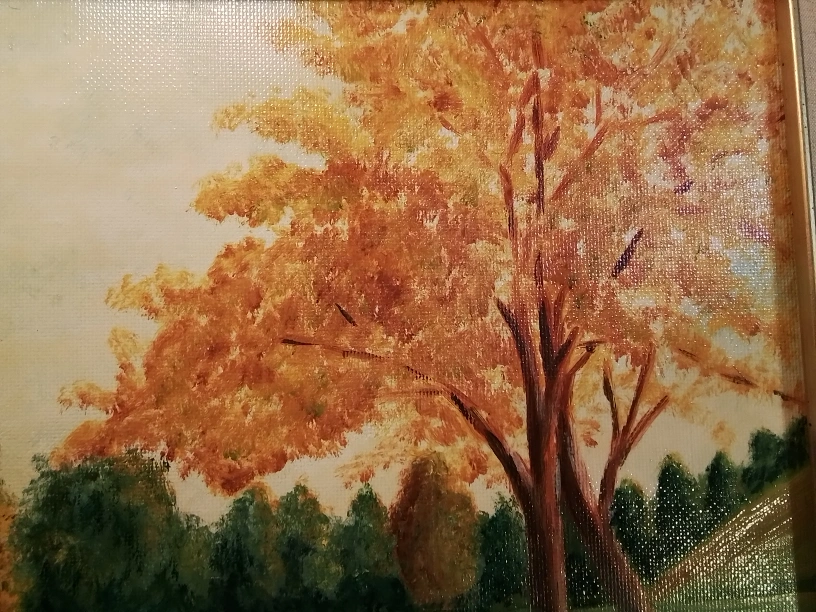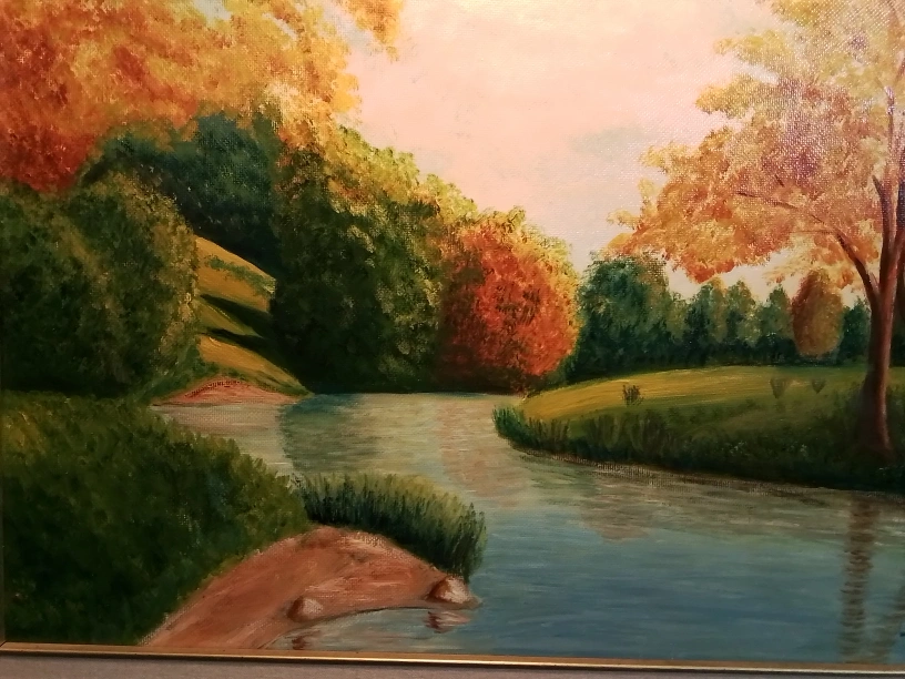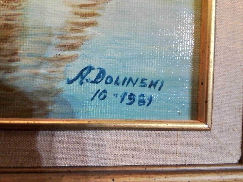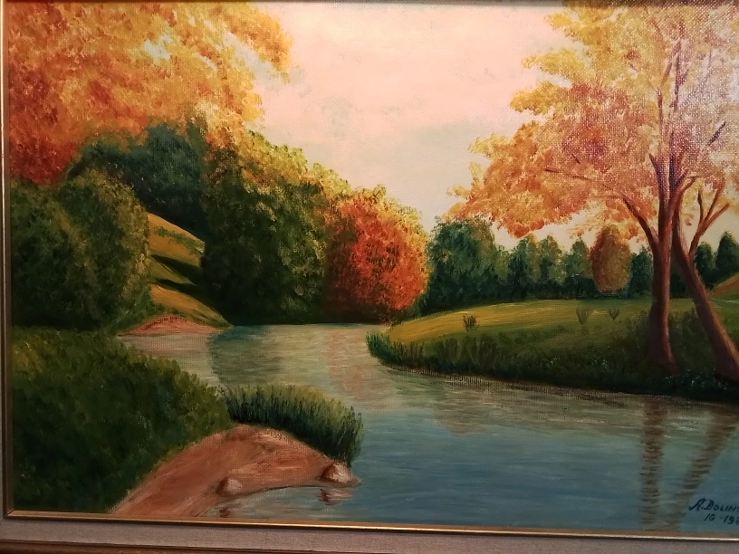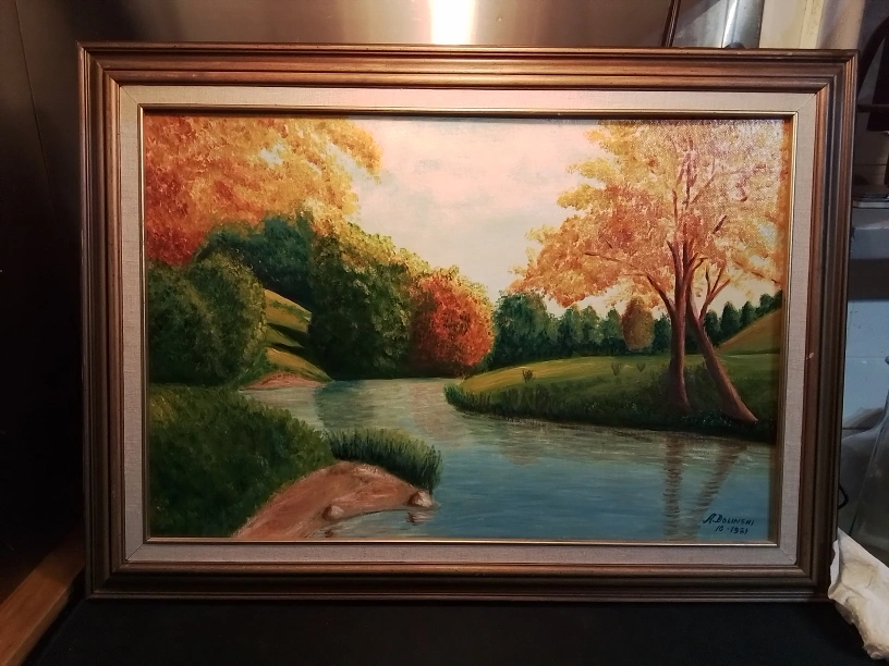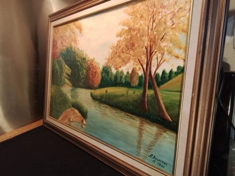 Original Autumn Landscape Oil Painting by A. Dolinski Framed autumn landscape painting. Features a river flowing through a valley with trees displaying vibrant fall colours. Signed by the artist, A. Dolinski, and dated 10 '81. Gold coloured frame. Measurements 28 1/4 × 20 3/4 Pickup at Young Street and Steels Ave
