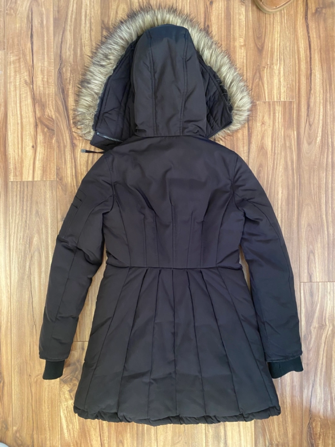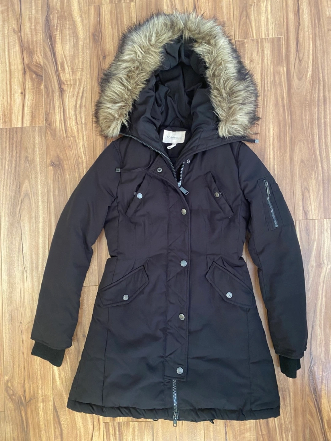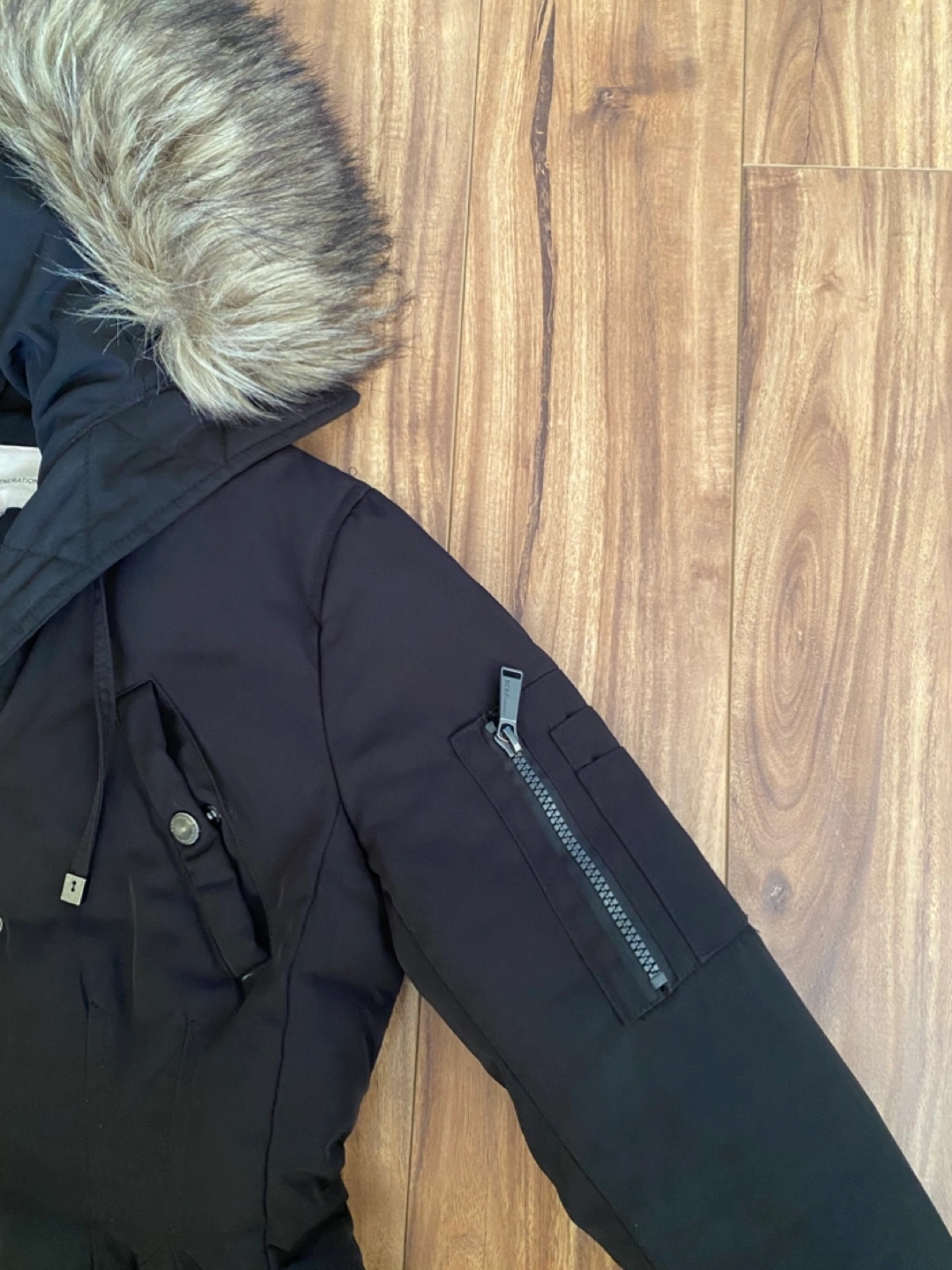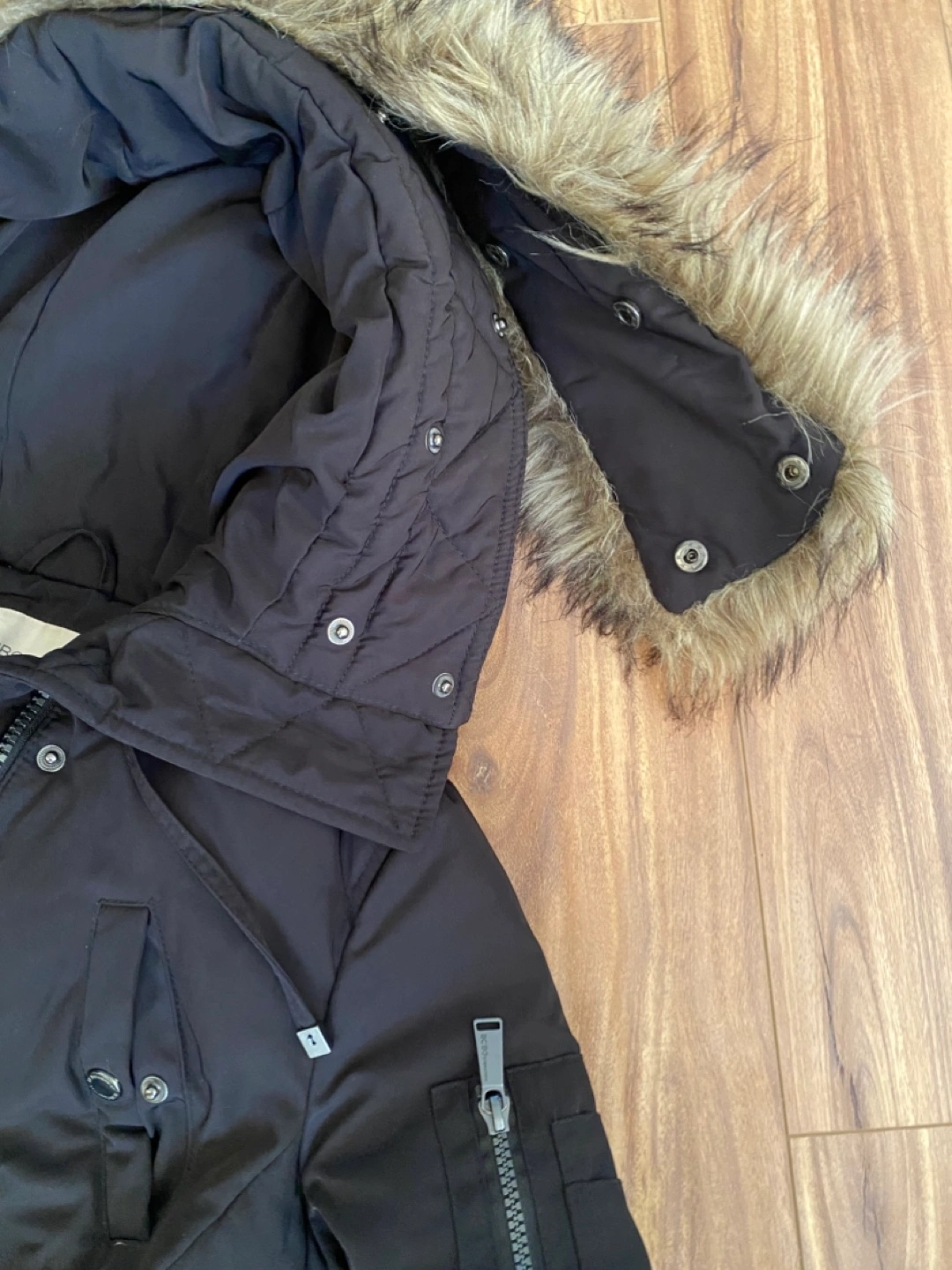 Women's black parka. Faux fur-trimmed hood. Zipper and button closure. Multiple pockets. Size XS. Excellent condition. Shoulders 15,5’’ Bicep 14’’ Sleeve length 26’’ Chest 38’’ Waist 31’’ Hips 40’’ Length of the jacket 31ʼʼ
