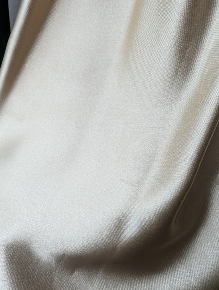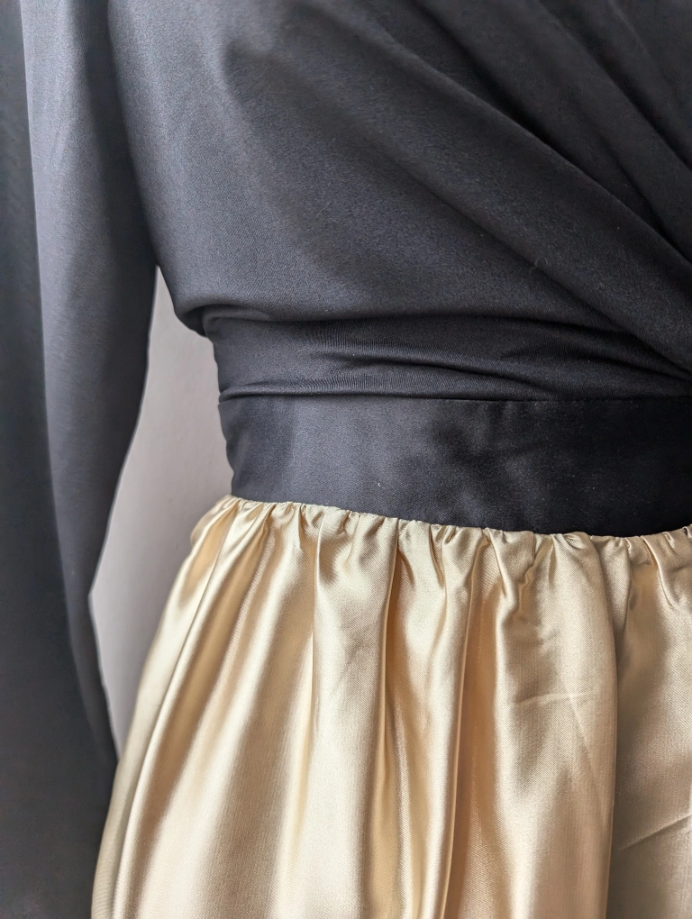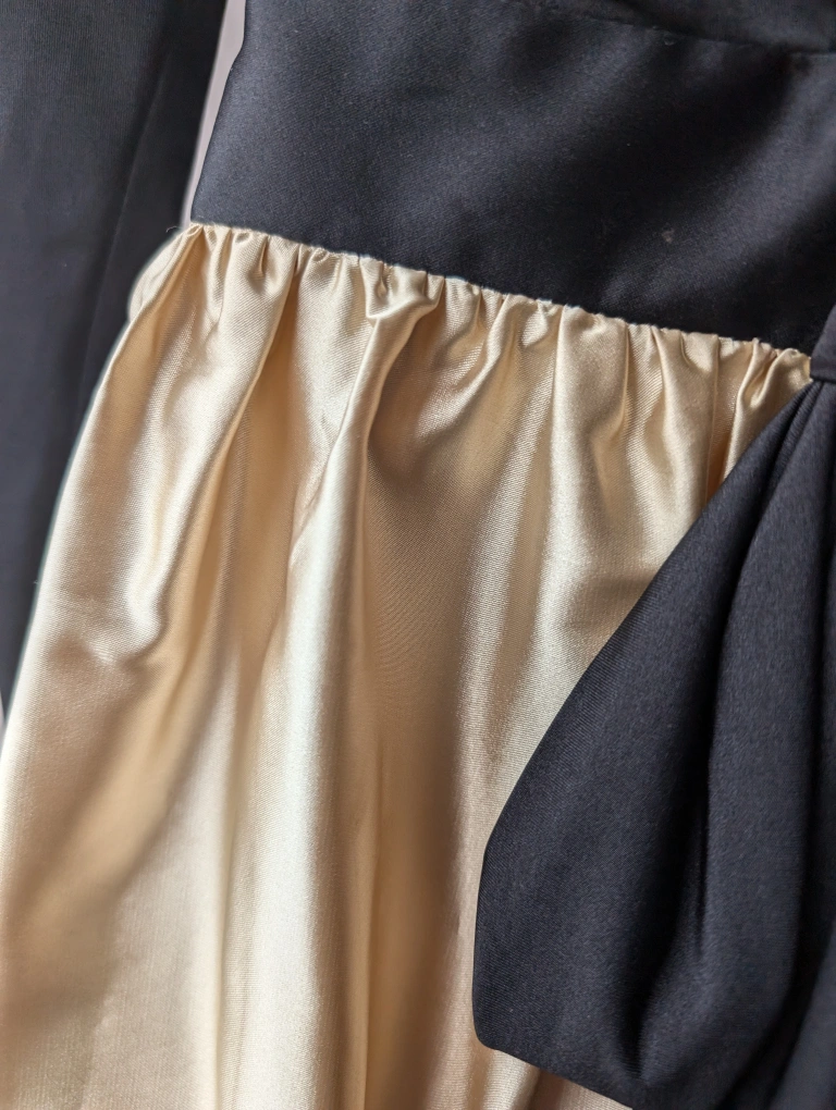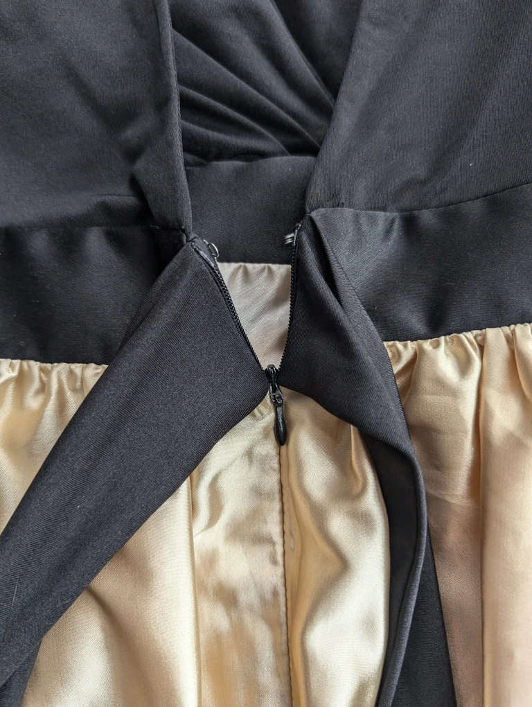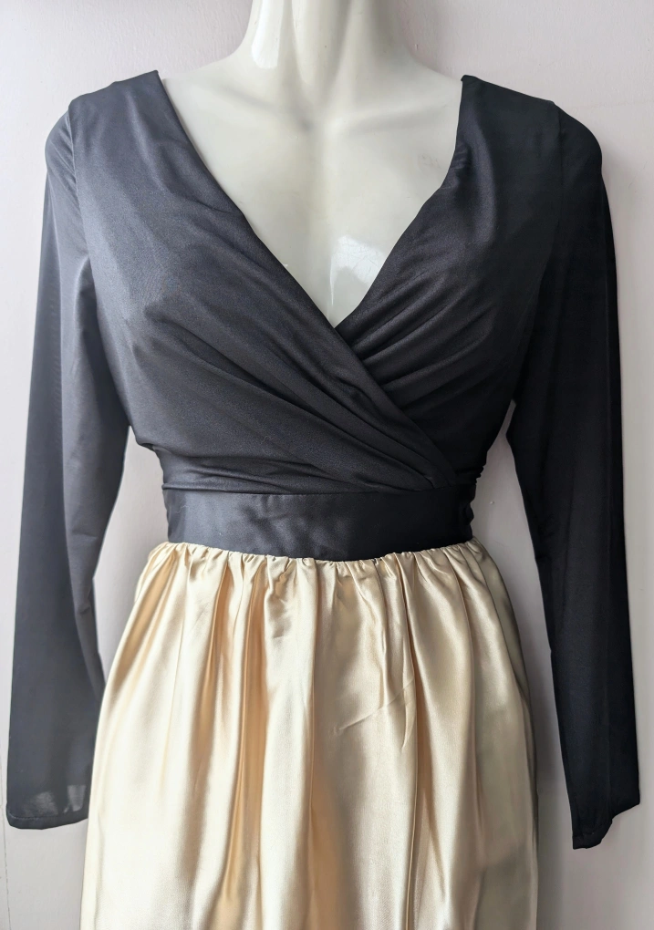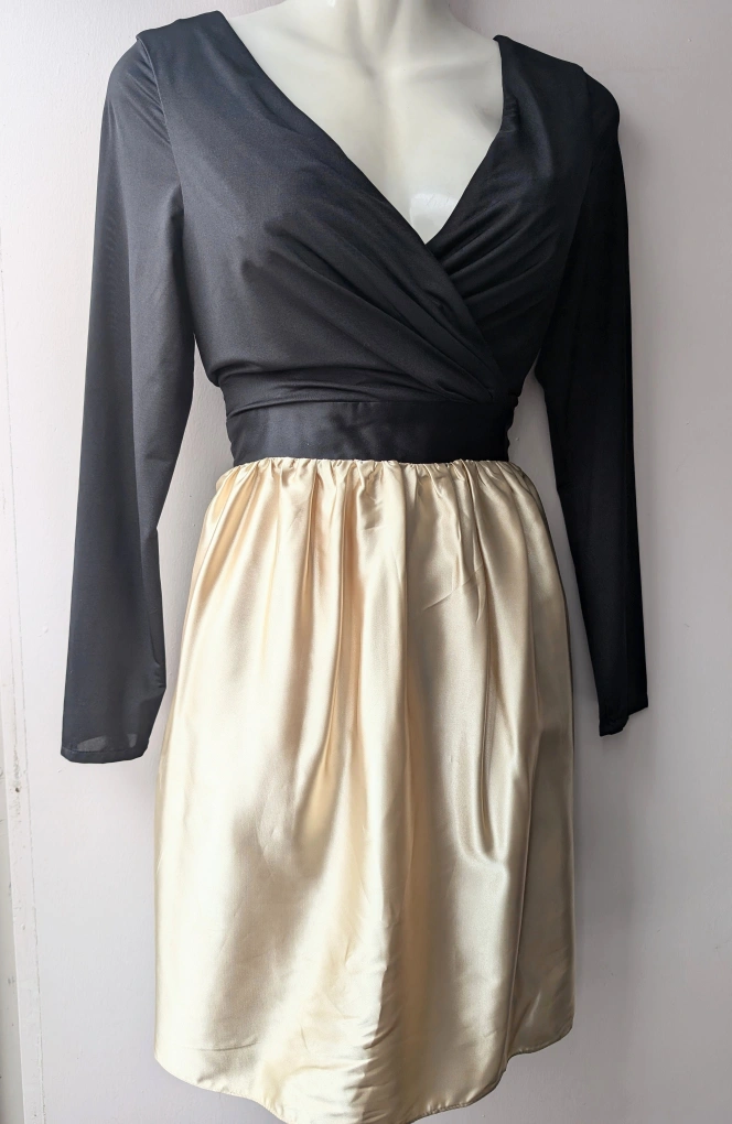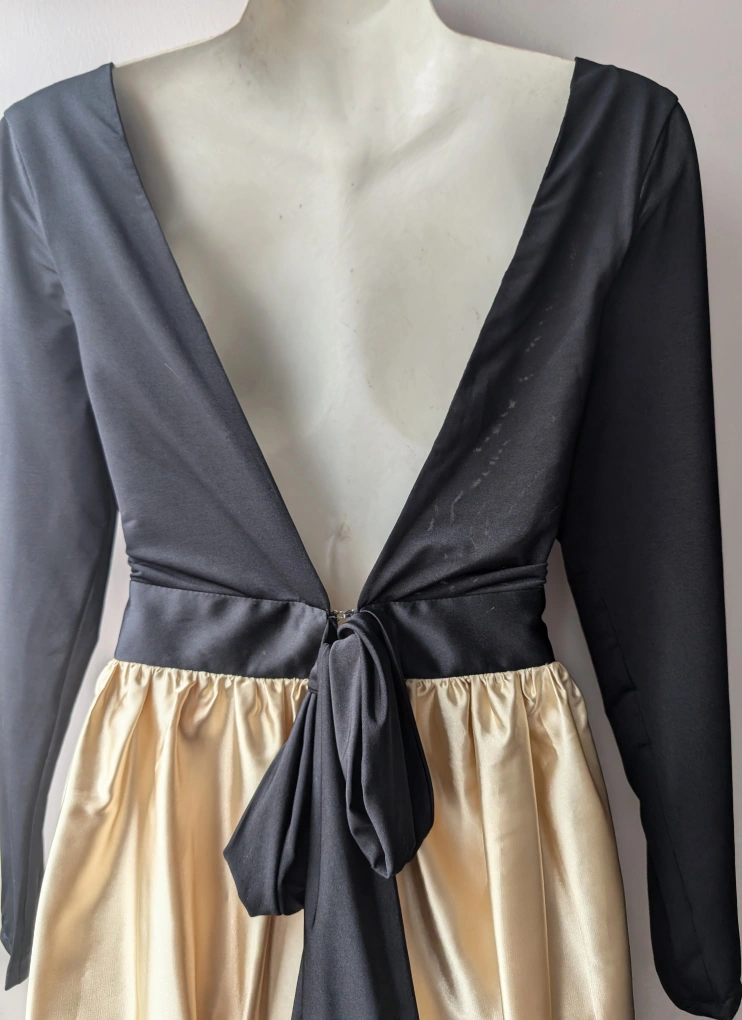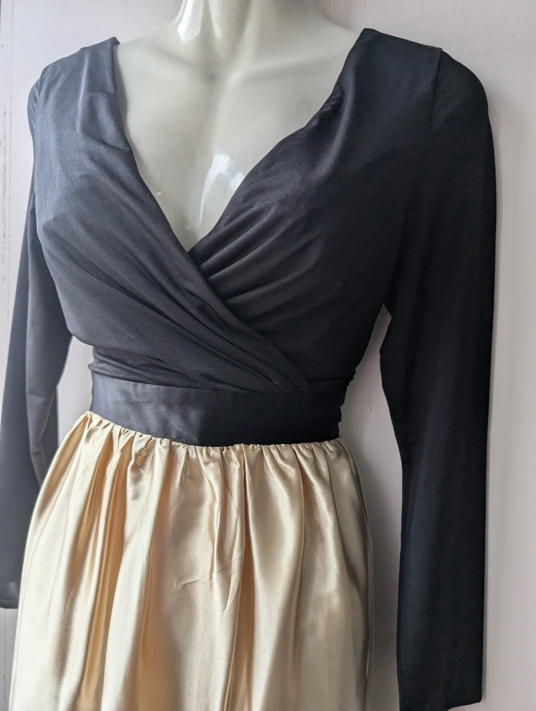 Stunning vintage black and gold dress from the 80's - 90's era V neck and back plunge, nylon type fabric with some stretch Back zipper Rusched skirt Skirt is lined, Poly/satin type fabric Not new, but good condition with no tears, holes, stains etc. Item was purchased clean, we did not launder No label, I think this is custom/handmade made belt long enough to tie around to front or tie into bow at back Measurements: taken with garment lying flat, measured in inches length: from top of shoulder to bottom hem: 34" waist: 26" bust: 32-34, recommend smaller cup size A or B recommend for a petit small figure. Bodice is not very long Item pinched at back for photos. Mannequin is a size extra small, waist 22 inches, A cup bust Not new, but pretty good condition with no holes or tears. There are some very faint scuff marks on gold. Hard to see in folds. Not laundered, clean already