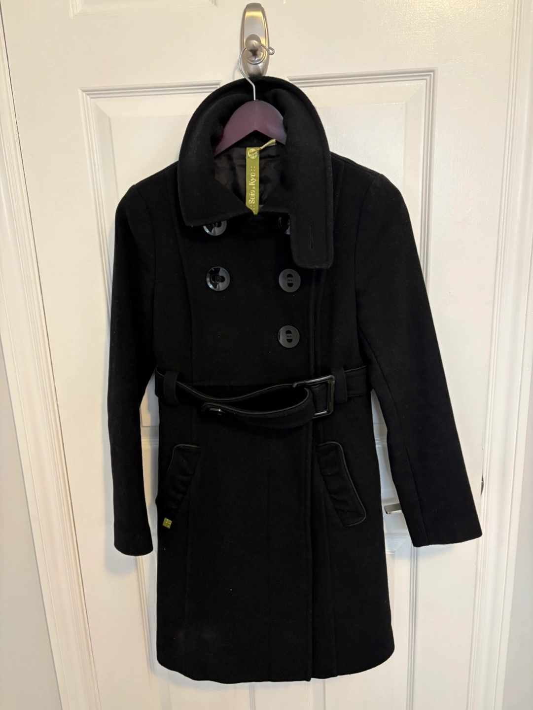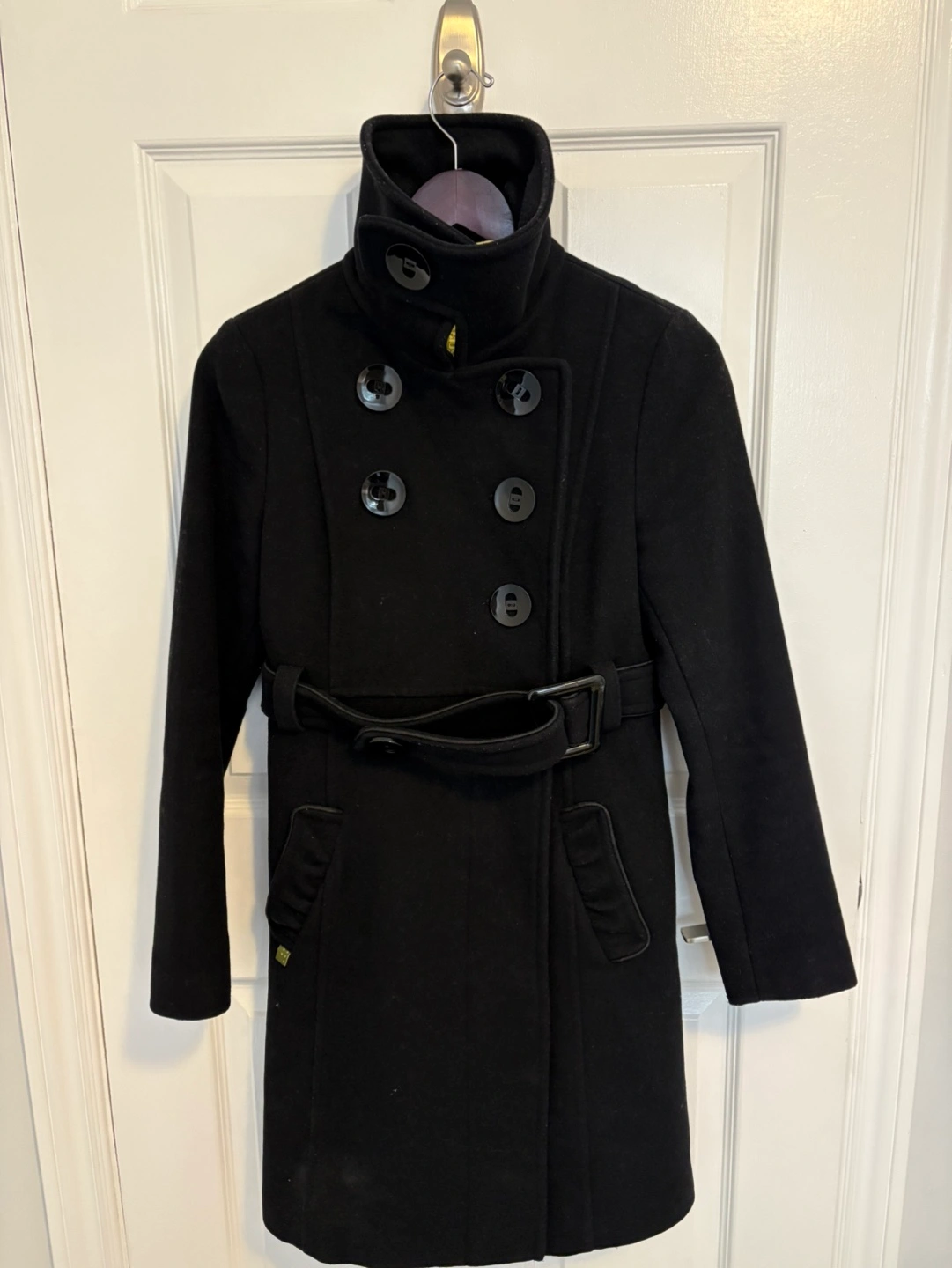 Women's black peacoat. Double-breasted. Belted waist. High collar. 80% wool. 20% nylon. From smoke and pet free home. Cash only. Pick up only.