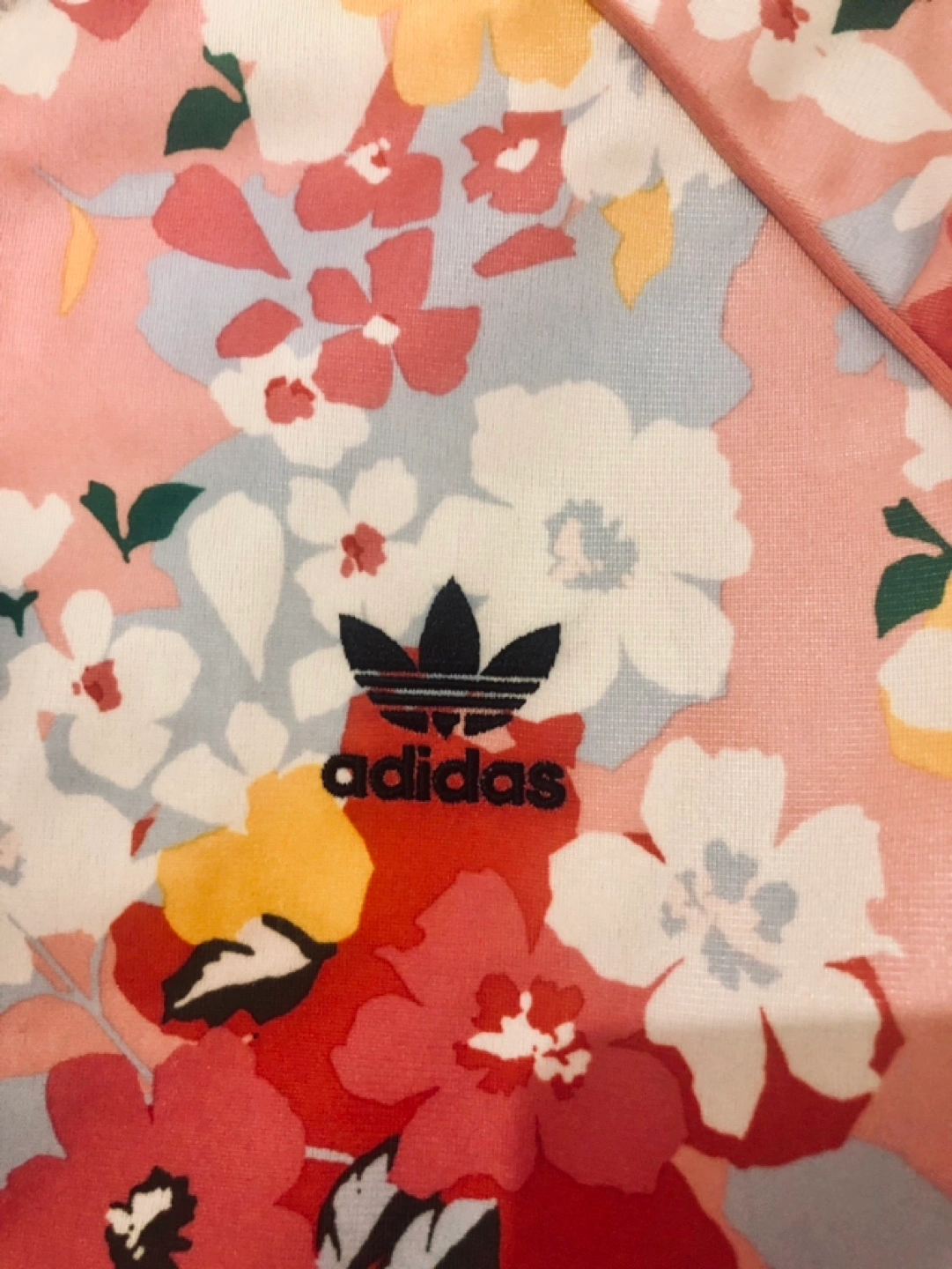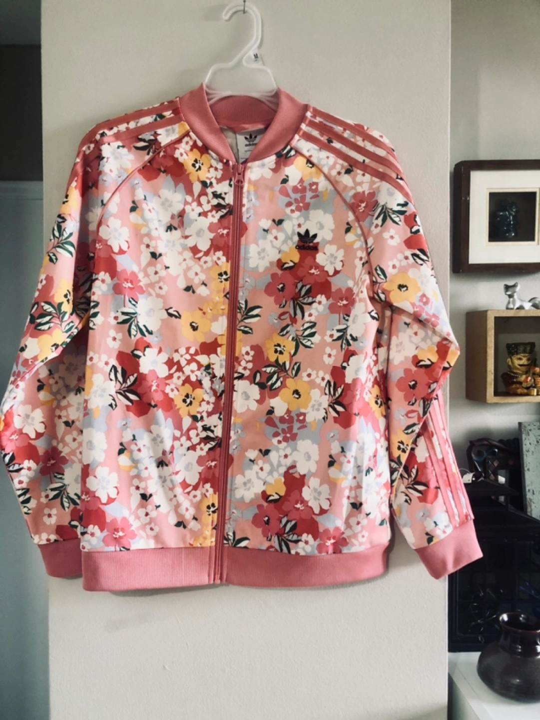 Women's Adidas track jacket. Pink floral print. Zip-up front. Long sleeves. Ribbed cuffs and hem. Classic Adidas three stripes on sleeves.