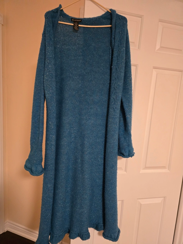 Long cardigan sweater. Features a hood, long sleeves, and a ruffled hem. Size L/G. 53% acrylic, 7% wool, 35% polyester, 4% nylon.