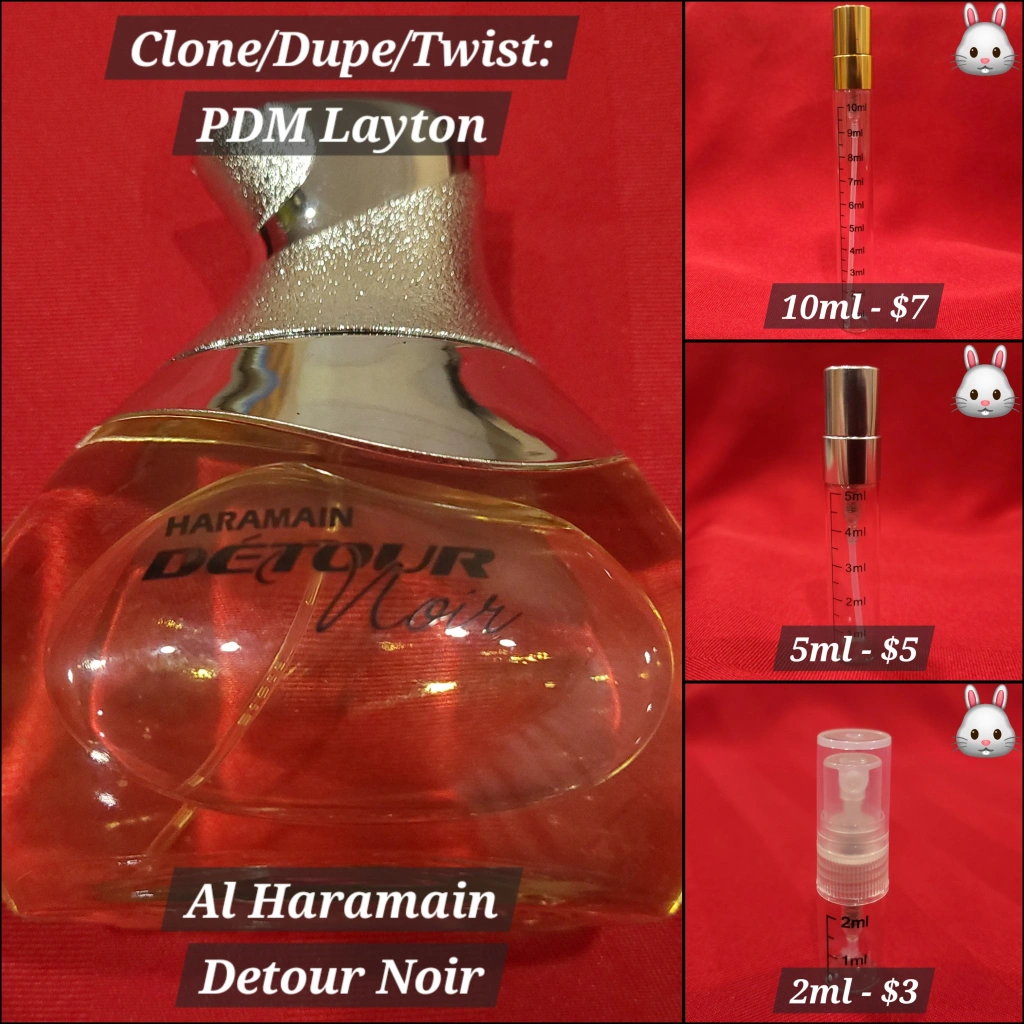 Al Haramain Detour Noir perfume, a clone of PDM Layton. Available in 2ml, 5ml, and 10ml sizes. See image for pricing.