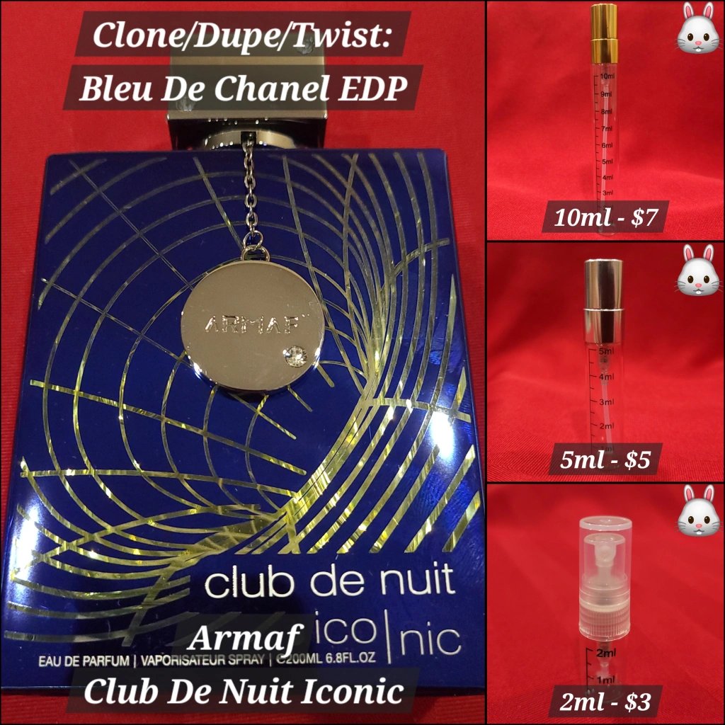 Armaf Club De Nuit Iconic Eau De Parfum. Inspired by Bleu De Chanel EDP. Decant options available: 2ml, 5ml, 10ml.