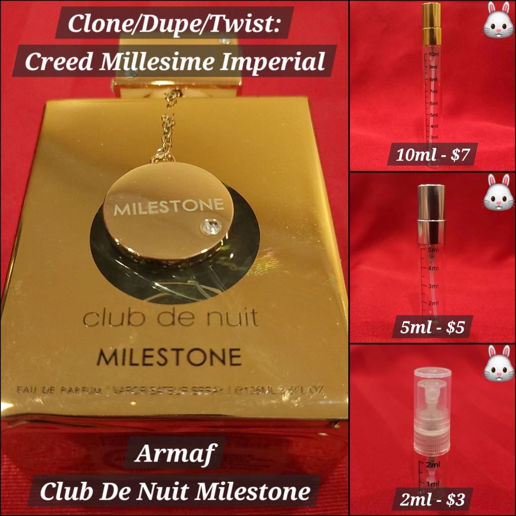 Armaf Club De Nuit Milestone perfume, a Creed Millesime Imperial clone. Gold box, comes with samples: 2ml, 5ml, and 10ml available.