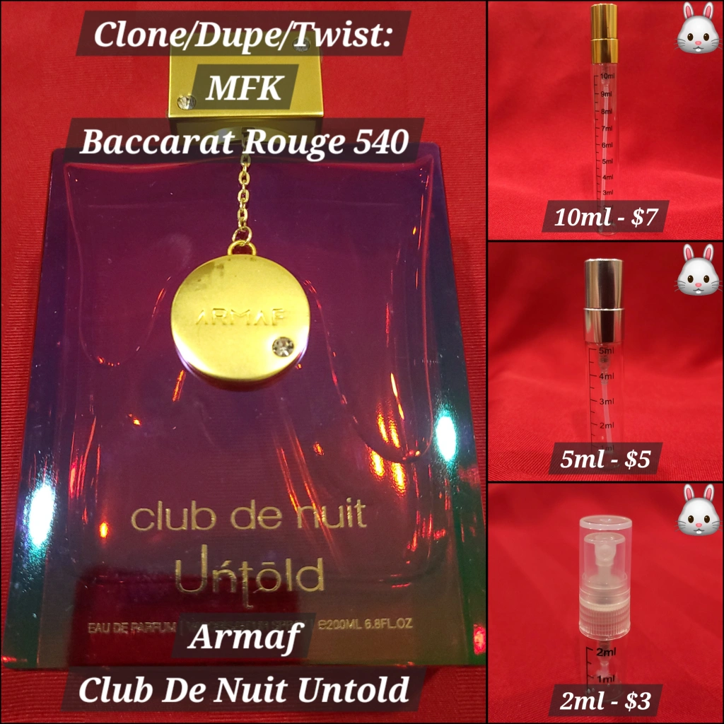 Armaf Club De Nuit Untold Eau De Parfum. Clone/dupe/twist of MFK Baccarat Rouge 540. Available in 2ml, 5ml, and 10ml sizes.