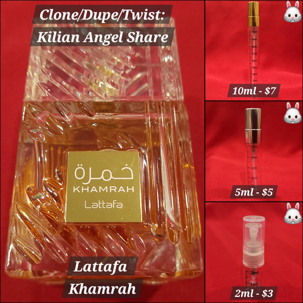 Lattafa Khamrah perfume, a dupe of Kilian Angel Share. Available in 2ml, 5ml, and 10ml sizes. Beautiful bottle. See image for pricing.