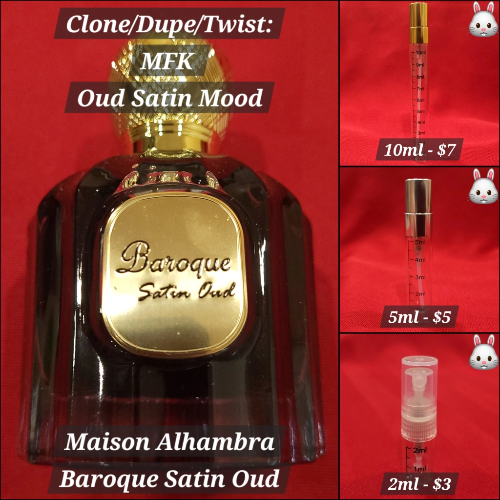 Maison Alhambra Baroque Satin Oud perfume, a clone of MFK Oud Satin Mood. Available in 2ml, 5ml, and 10ml sizes.