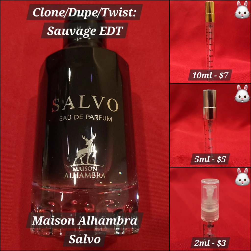 Maison Alhambra Salvo Eau De Parfum. Clone/Dupe/Twist of Sauvage EDT. Available in 2ml, 5ml, and 10ml sizes.