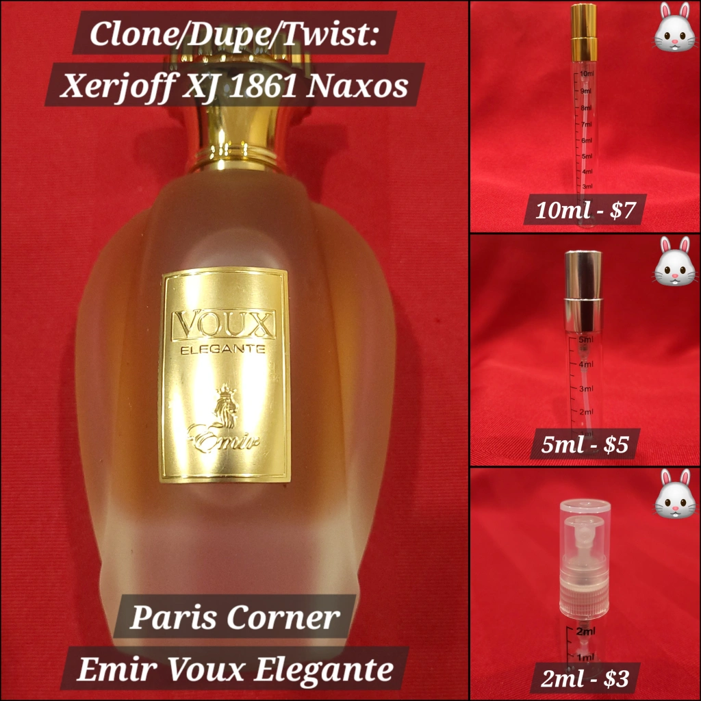 Paris Corner Emir Voux Elegante perfume, a clone of Xerjoff XJ 1861 Naxos. Available in 2ml, 5ml, and 10ml sizes. Pricing varies by size.