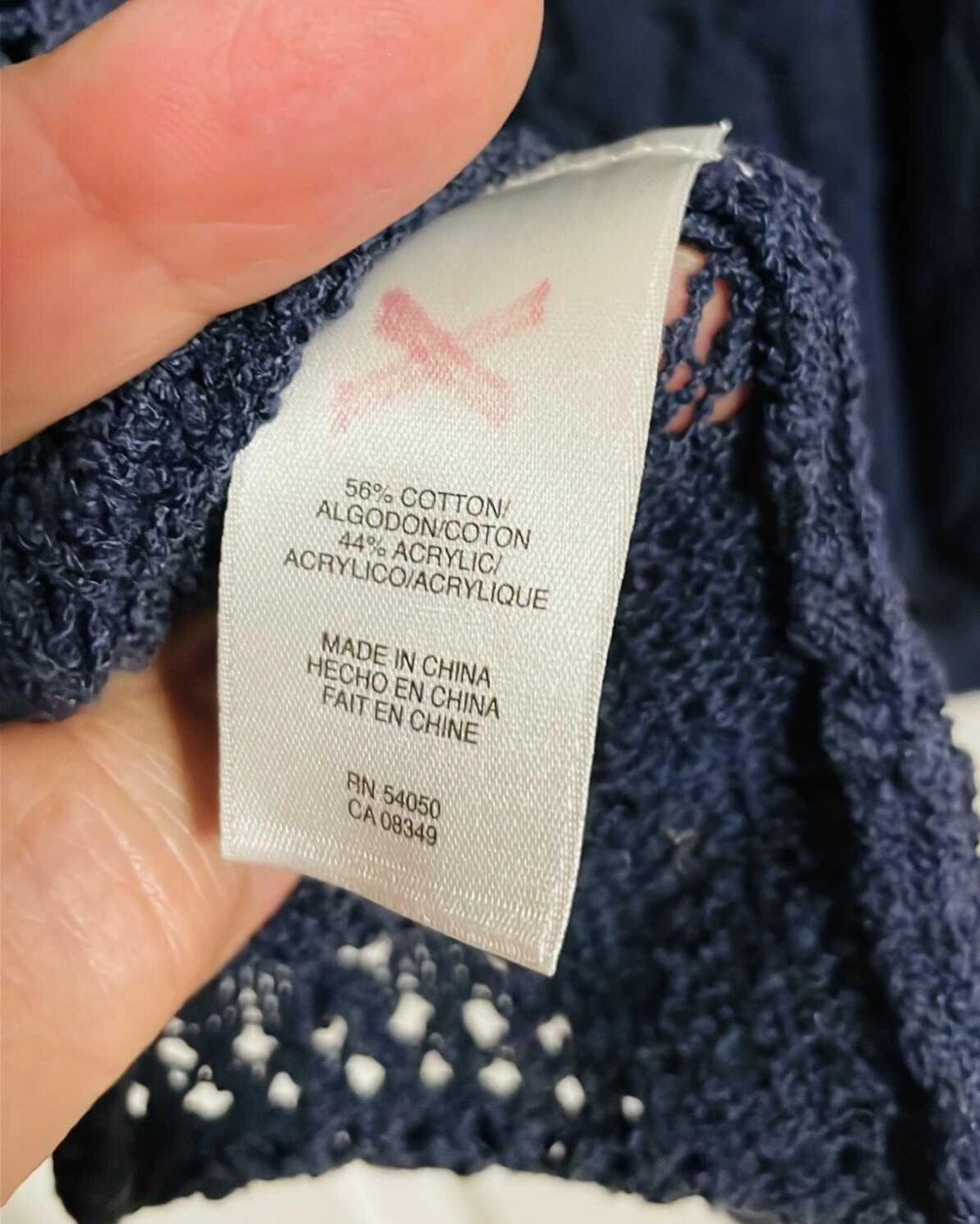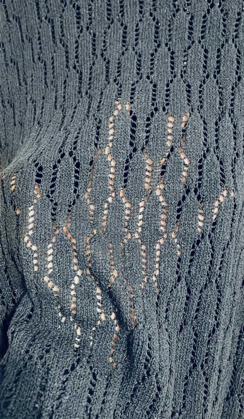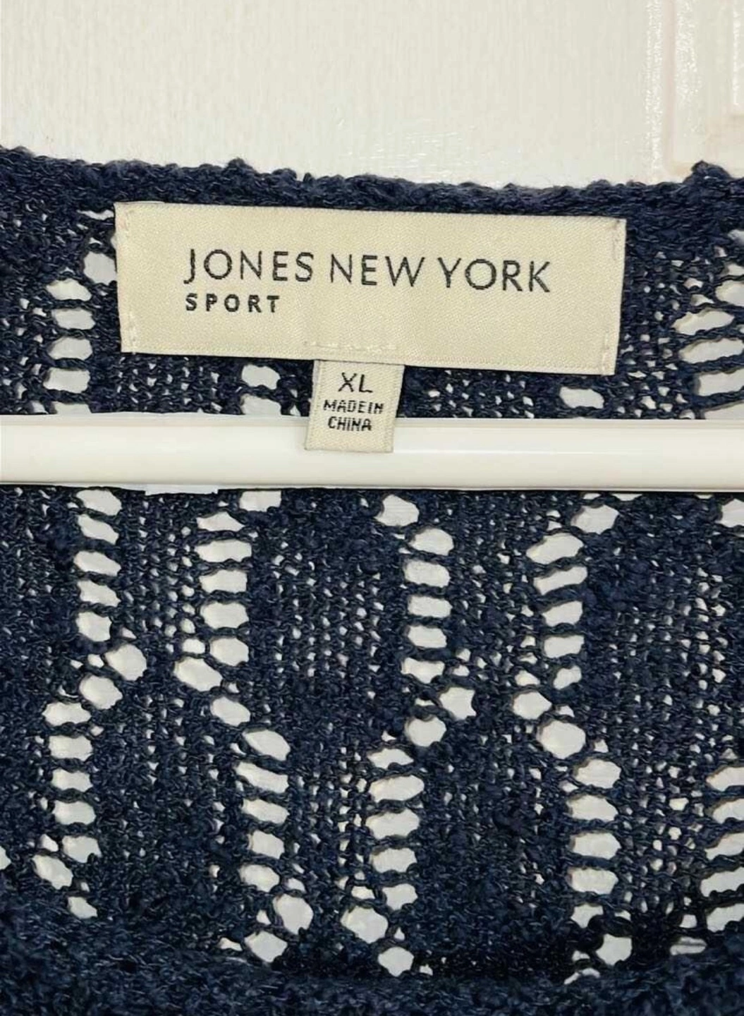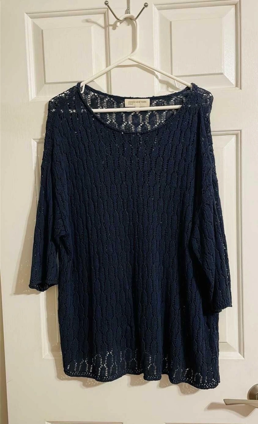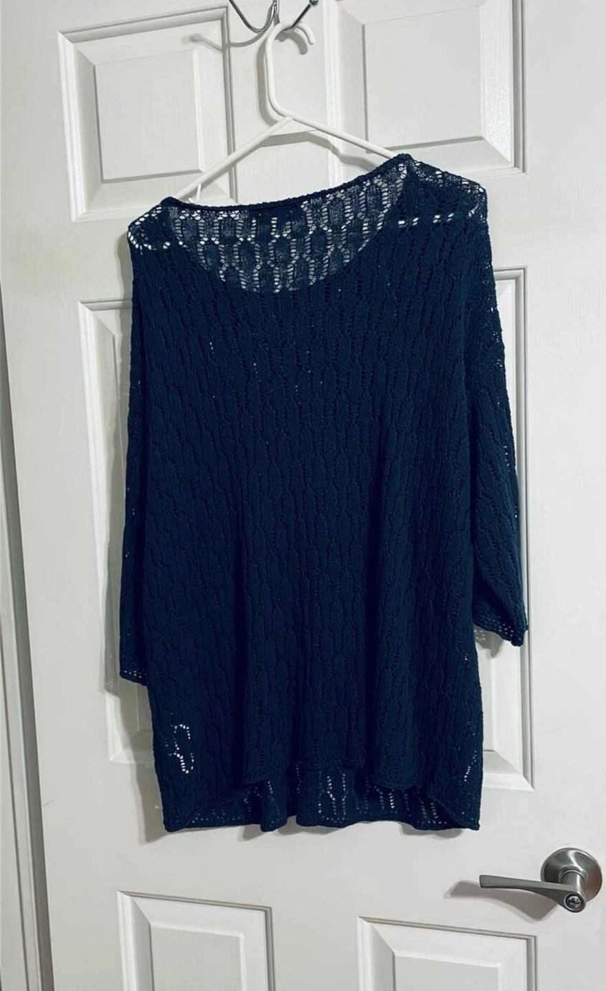Excellent condition. Size XL. Wore this a few times and still looks brand new. Very nice top. Dark navy blue, open knit, three-quarter sleeve sweater. Size XL. 56% cotton, 44% acrylic.