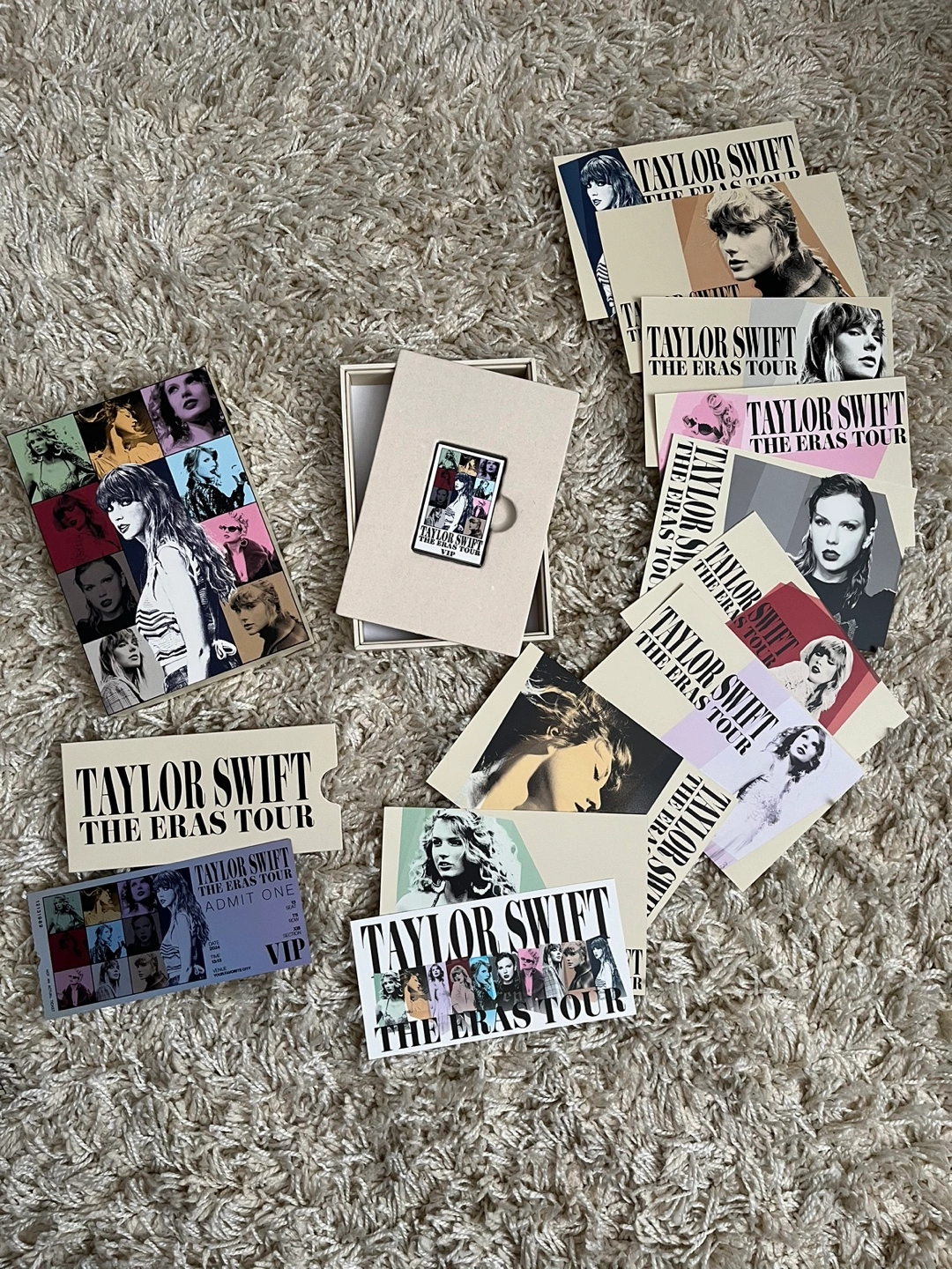 Taylor Swift Eras Tour VIP package. Includes box set, lanyard, VIP laminate, and postcards. Excellent condition. Perfect for any Swiftie!
