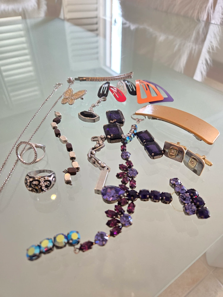 Free with any purchase Large lot of jewelry. Includes necklaces, rings, earrings, and hair clips. Various colors and styles. Silver-tone and gold-tone metals.