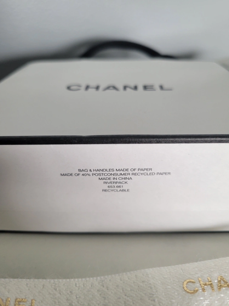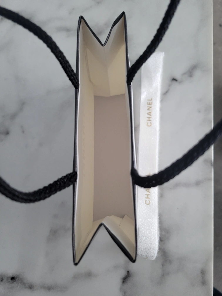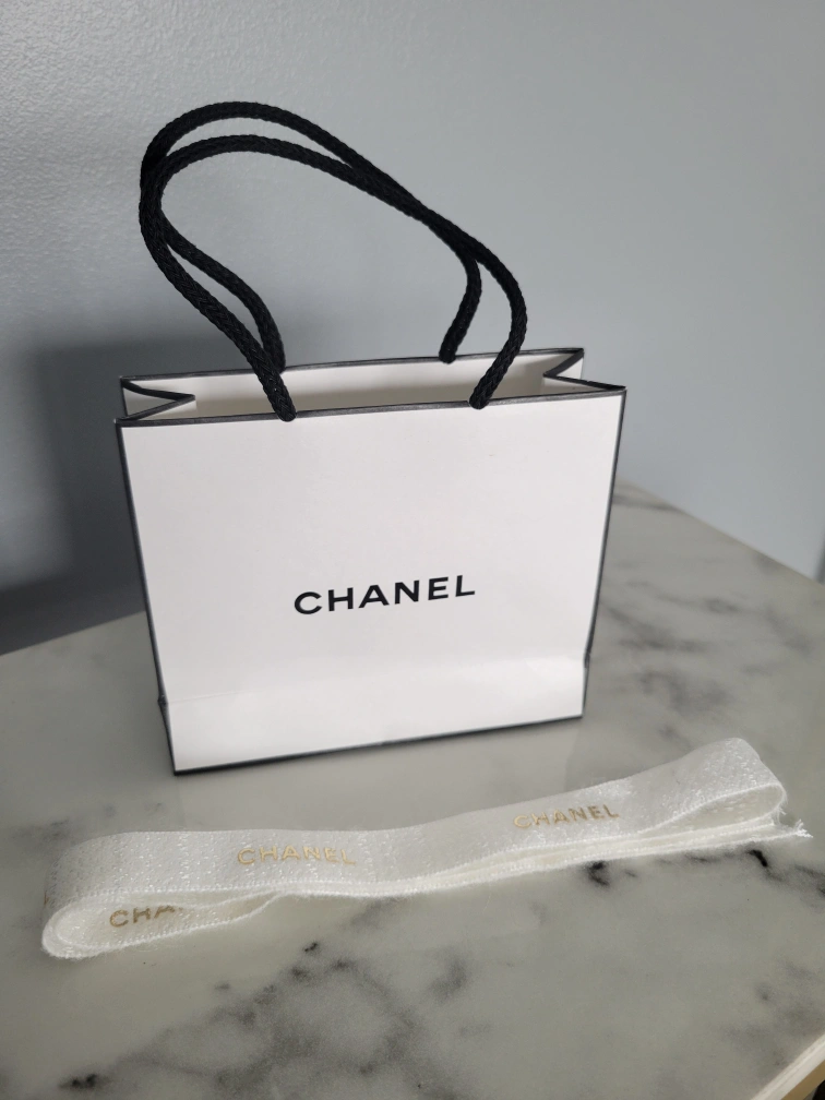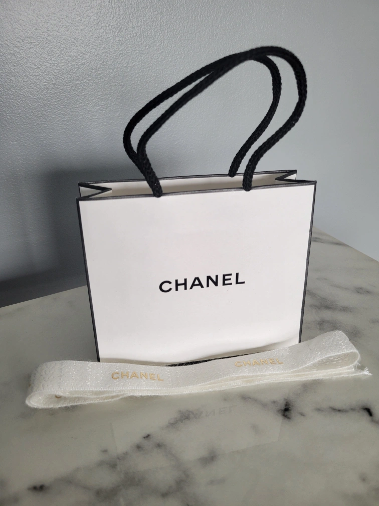 Small Chanel shopping bag. Black handles. Includes matching ribbon.