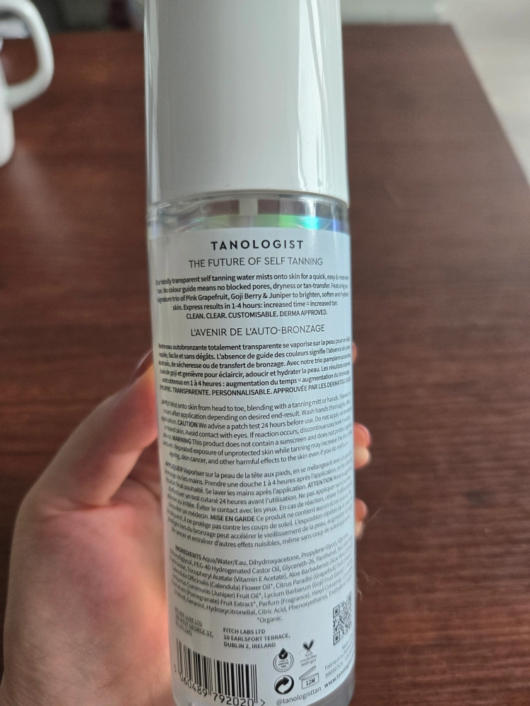 Lightly transparent self tanning water mist. Quick, easy application. No colour guide, so no blocked pores or tan transfer. Features Pink Grapefruit, Goji Berry & Juniper. Express results in 1-4 hours.