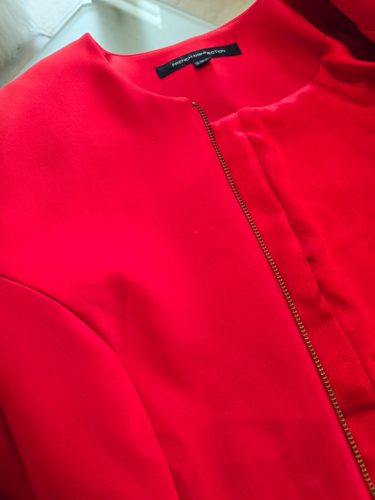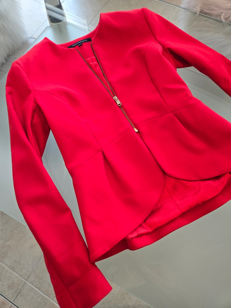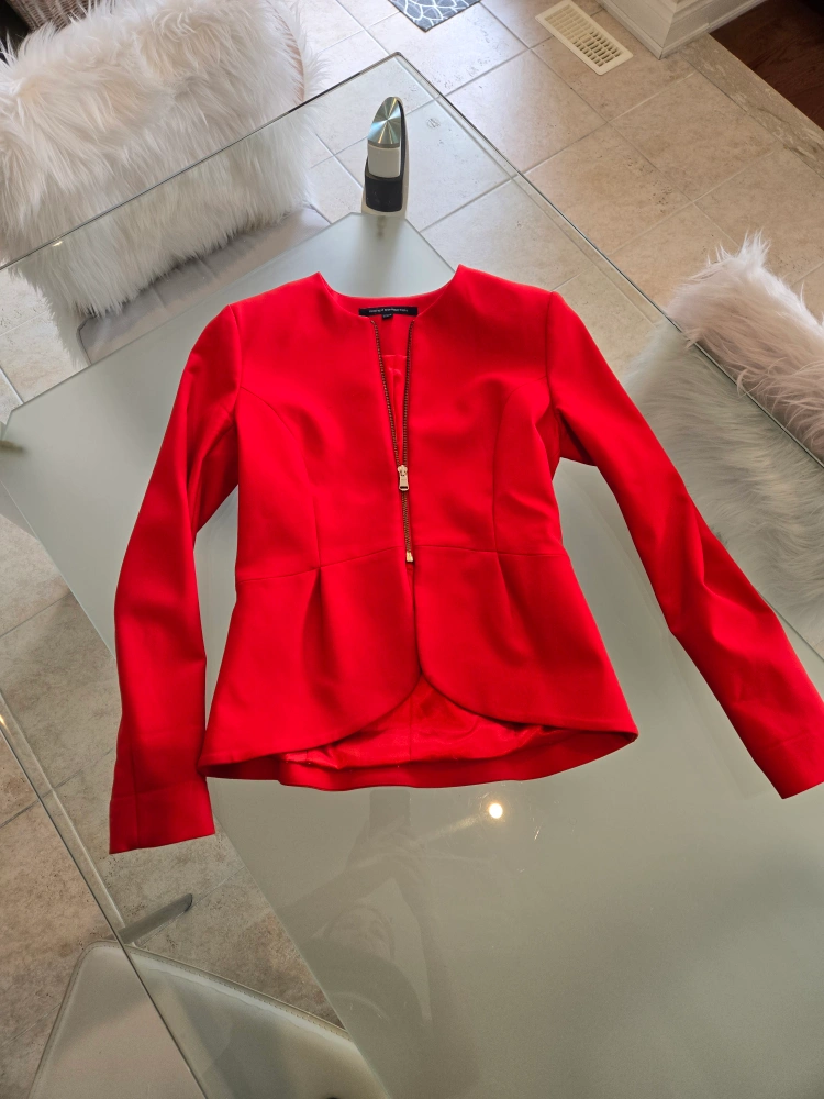 Bright red women's blazer. Features a front zipper and a slightly longer back hem. Long sleeves, size S Similar blazer is selling for $54 https://www.ebay.co.uk/itm/165647350063