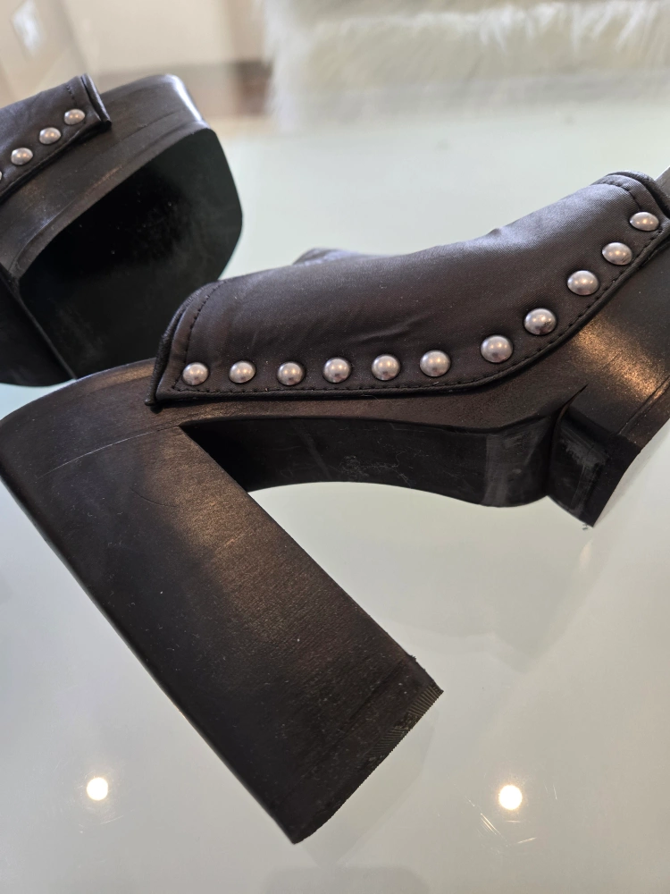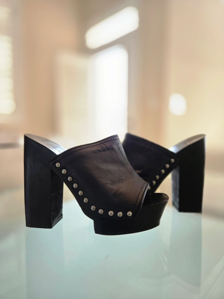 Bebe Pair of black leather platform clogs. Features chunky heels and silver studs. Open-toe design. Excellent for adding height and style to any outfit.