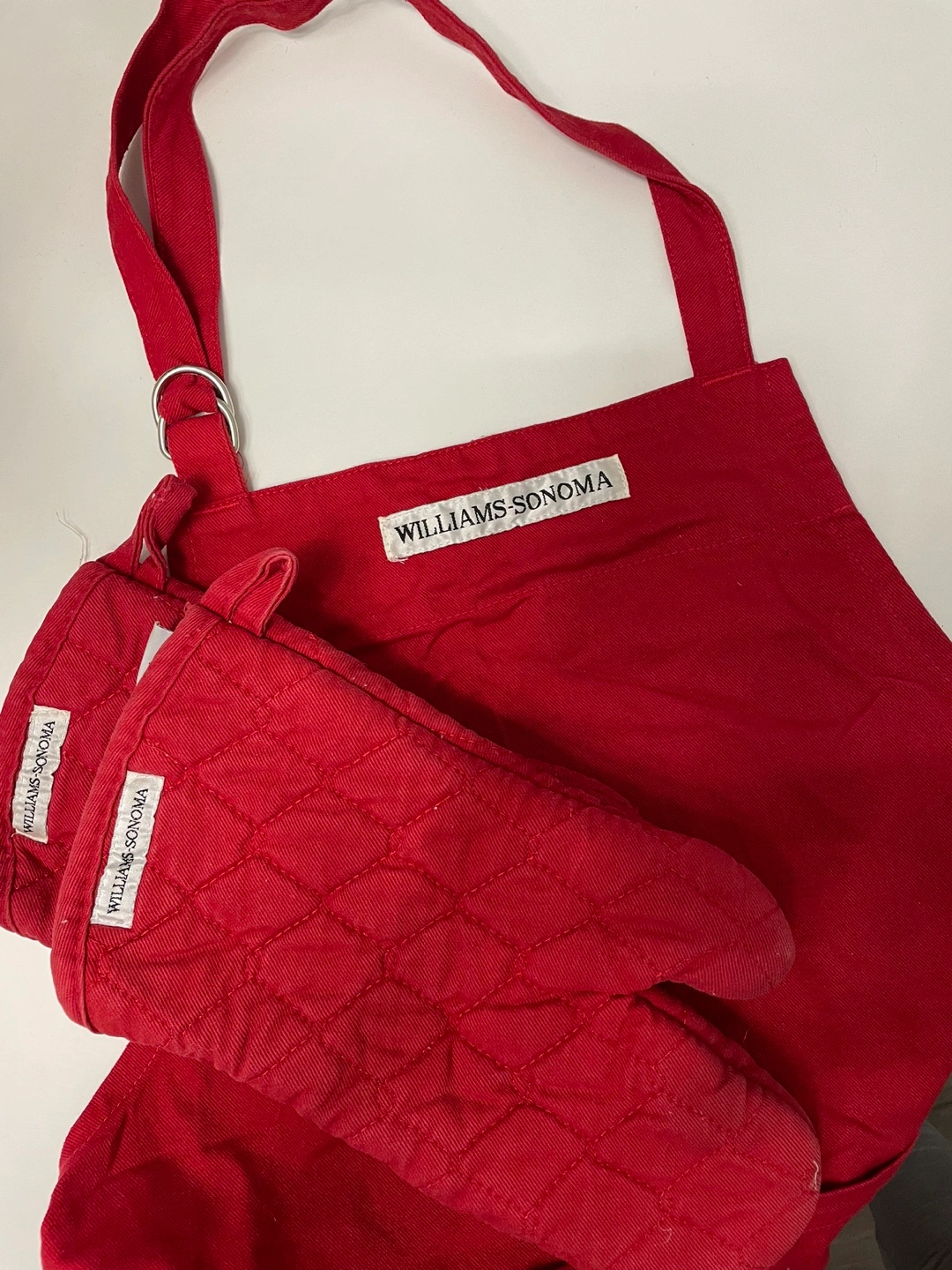 Apron was used once. Great condition. Comes with gently used oven mitts. Colour: Red
