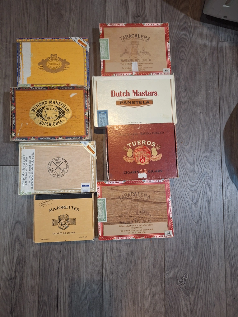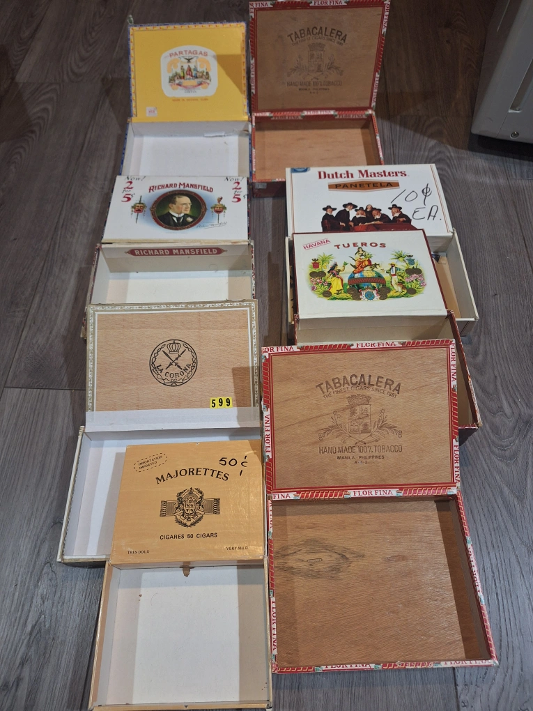 Assortment of empty cigar boxes. Various brands and designs. Great for collectors or crafting projects. Sold as a lot.