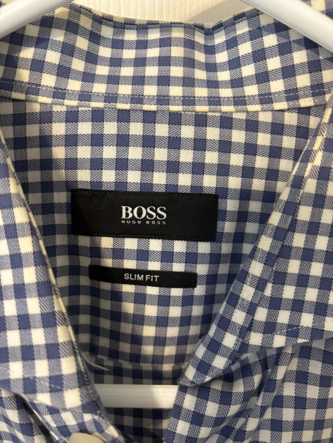 Men's Hugo Boss dress shirt. Slim fit. Blue and white gingham pattern. Size 41/16. Made in Turkey.
