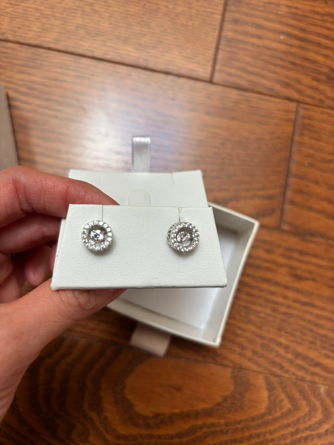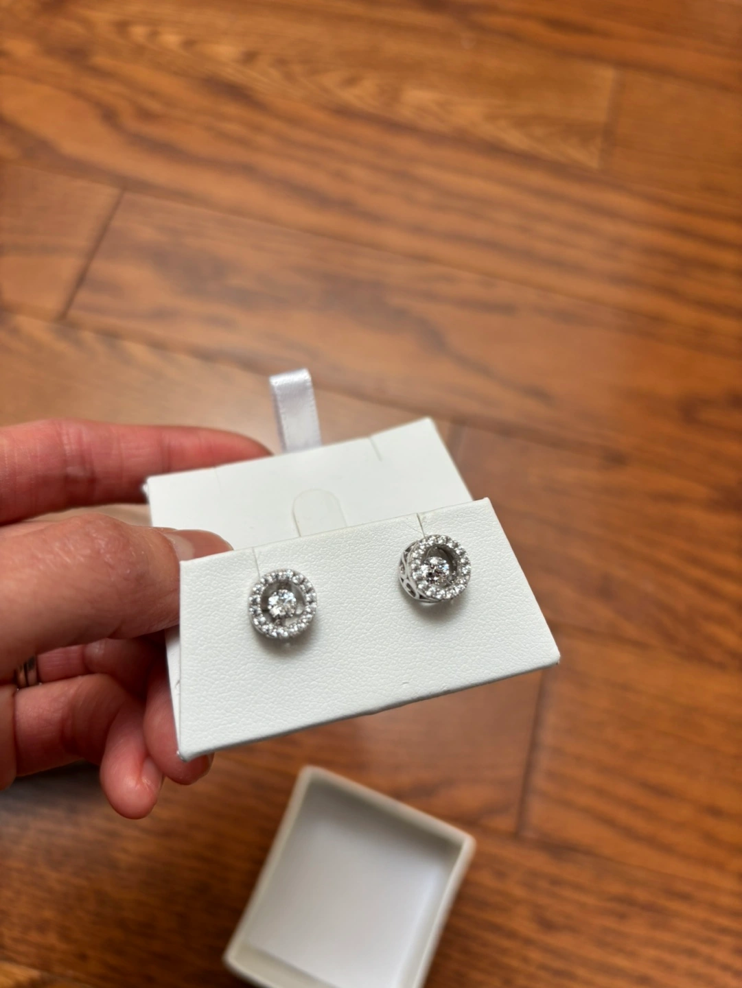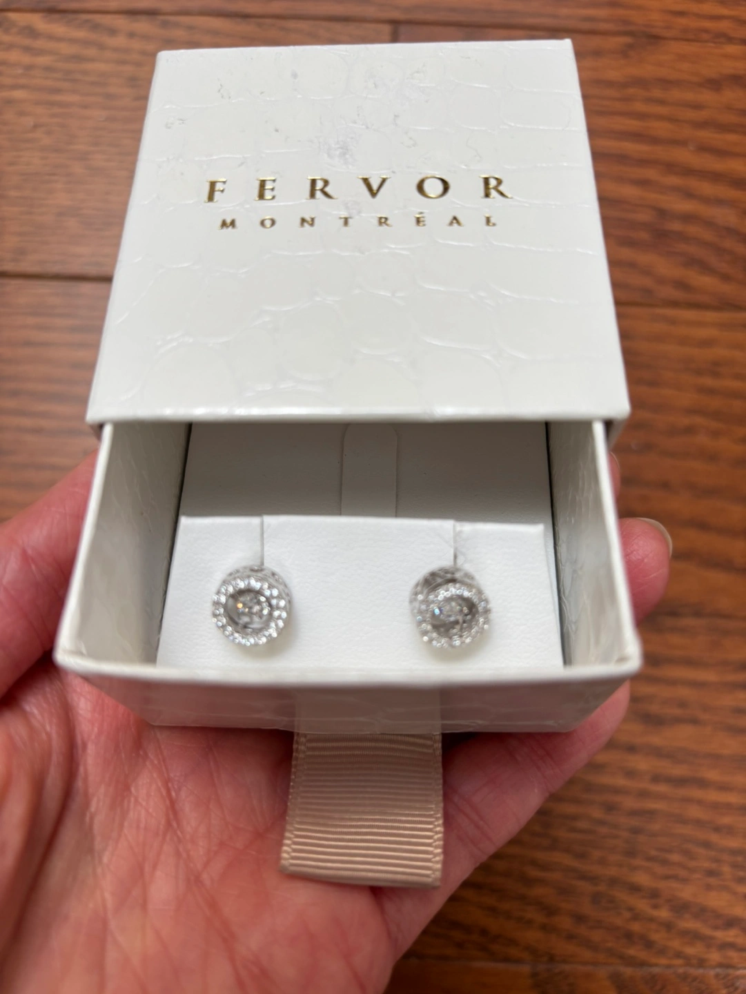Smoke free pet free home Pick up only Yonge & Steeles Item brought to driveway Received as Christmas gift but not really my style. Brand new Timeless, classic design. Excellent birthday anniversary Valentines day Mother’s Day gift. Last photo - see paper clip for size reference Stunning pair of silver stud earrings. Features a sparkly halo design. Presented in Fervor Montreal box. Elegant and perfect for any occasion.