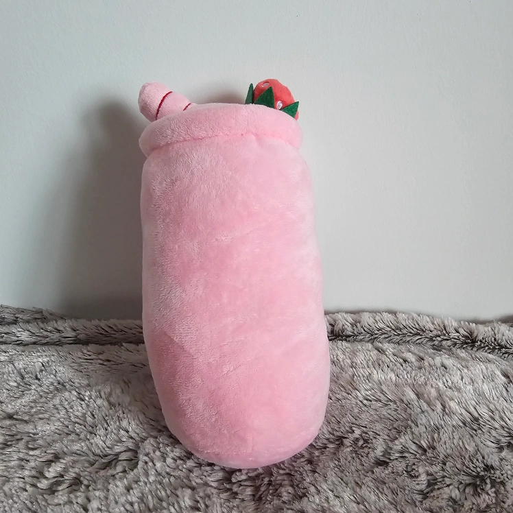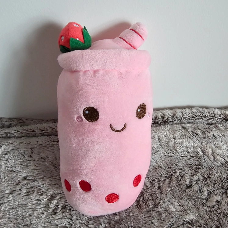Pink strawberry bubble tea plush toy. Soft and huggable. Features a cute face and strawberry topping. pick up near Markham Cineplex Theatre
