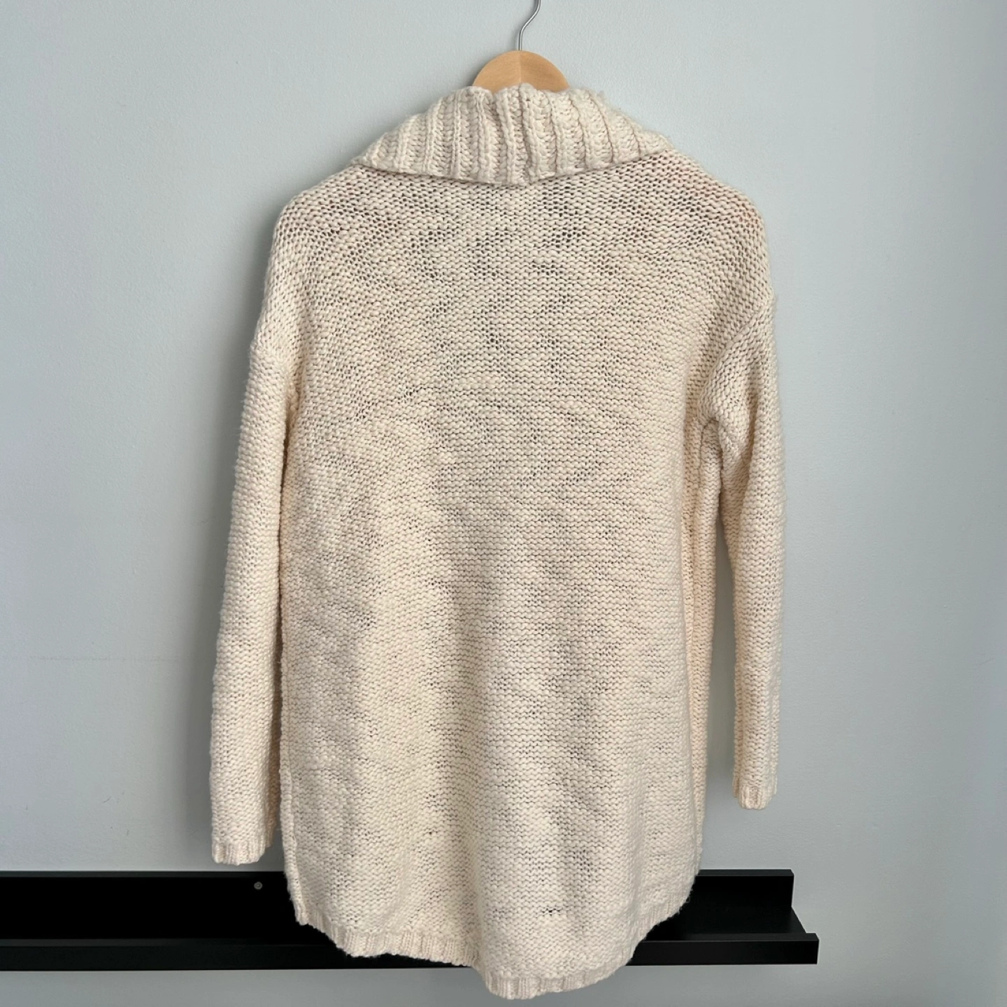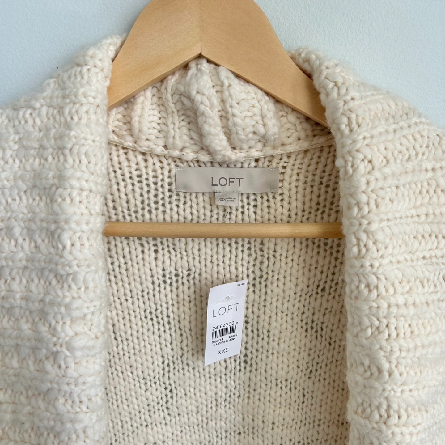 Long open-front cardigan by LOFT in a cream/ivory colour. It has a shawl collar, dropped shoulders and hits below the hip. 55% acrylic, 25% wool, 20% nylon. Very soft and not itchy! Listed as size XXS but I'm a size Small and it fits me great so it would likely fit anyone in the size range of XXS-S. New with tags! Pickup at Burnhamthorpe and East Mall or Front and Spadina