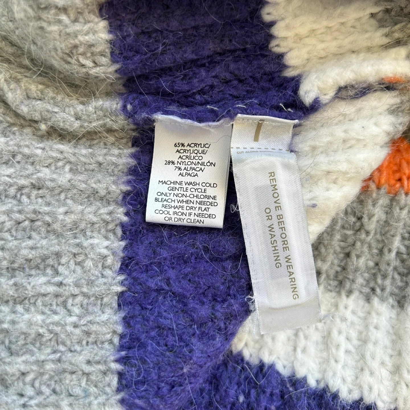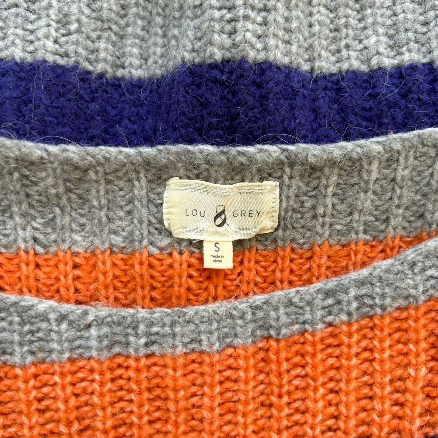 Striped sweater by Lou & Grey by LOFT featuring a boatneck, dropped shoulders, and three quarter sleeves. Listed as size Small but it’s oversize and can fit a Medium as well. Acrylic, nylon, and alpaca blend. In excellent condition, only worn a couple of times. Pickup at Burnhamthorpe and East Mall or Front and Spadina.