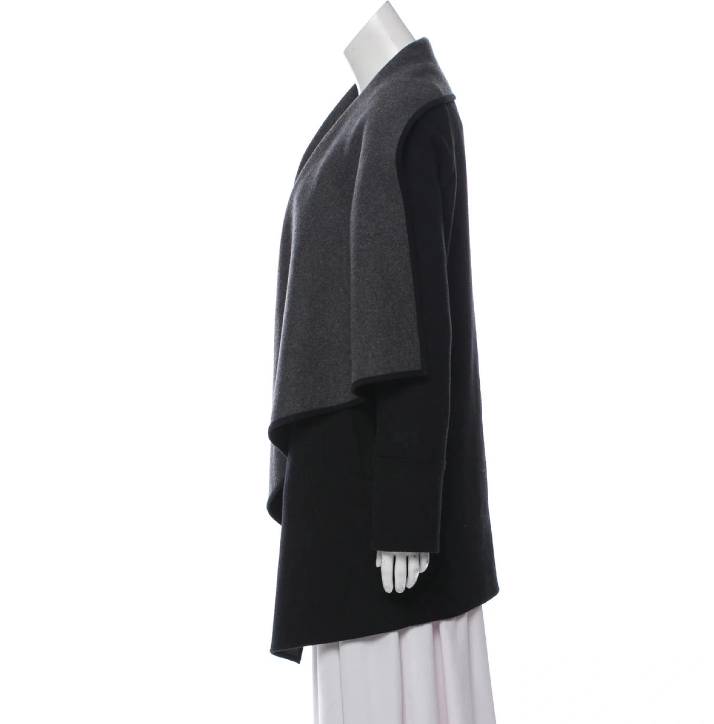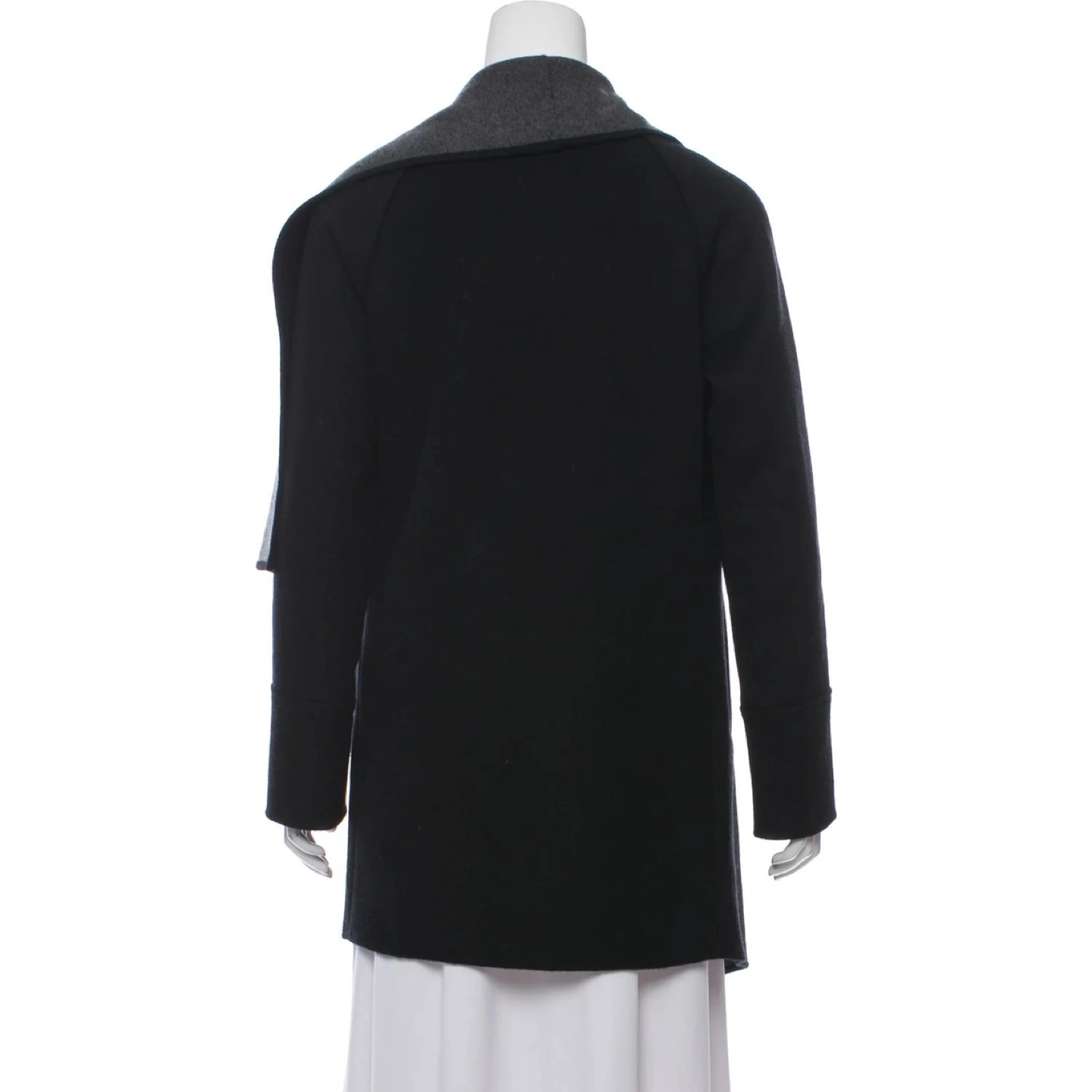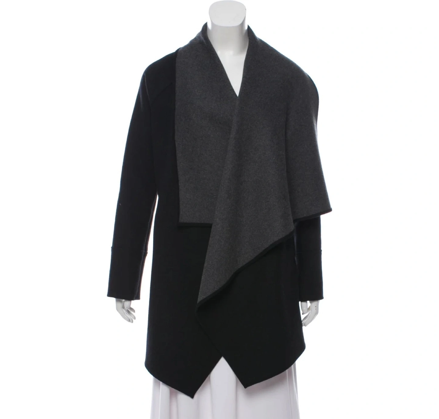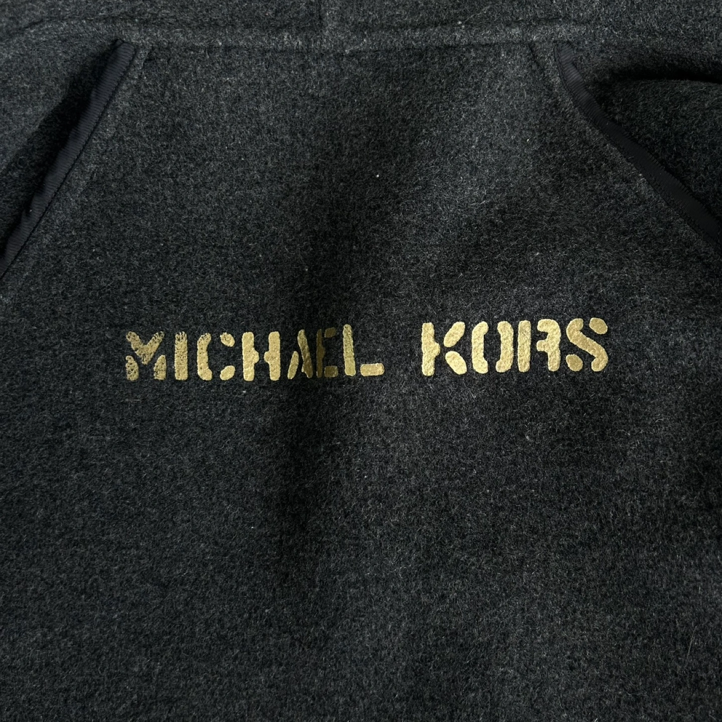 Black and grey Michael Kors wool-blend heavy open coatigan with a waterfall collar and dual slit pockets at sides. Designer size XS. Made in Italy. Estimated item measurements Bust: 40" Waist: 36" Length: 34" Fabric: 52% Wool, 45% Polyester, 1% Acrylic, 2% Other Fibers Condition: Excellent pre-owned. No flaws. Pickup at Burnhamthorpe and East Mall or Front and Spadina