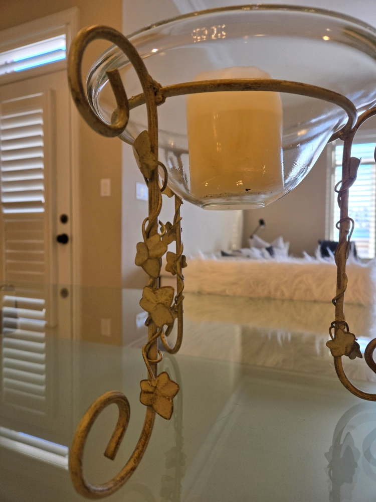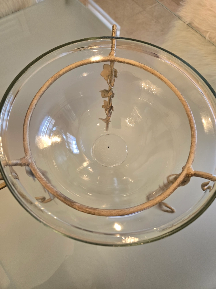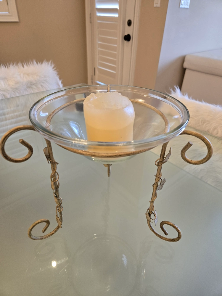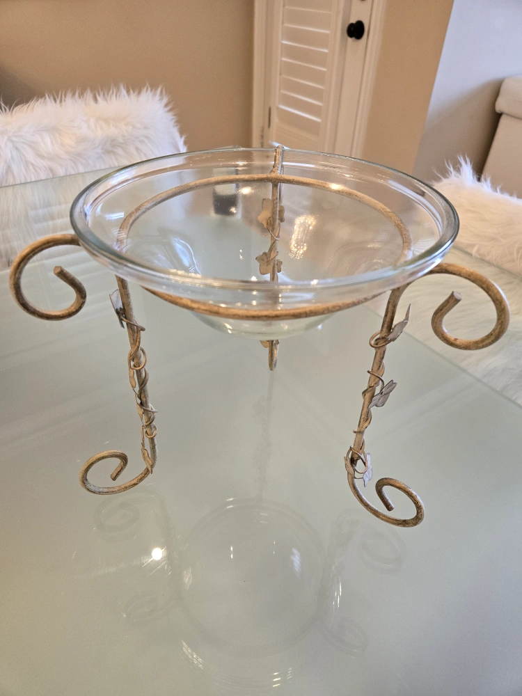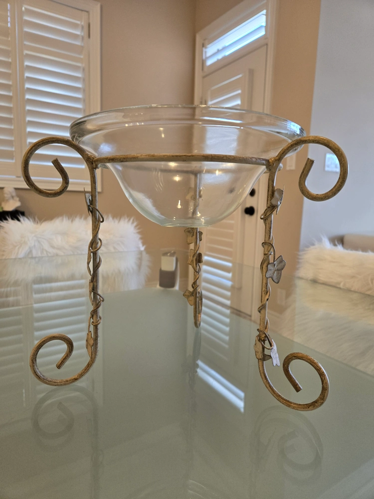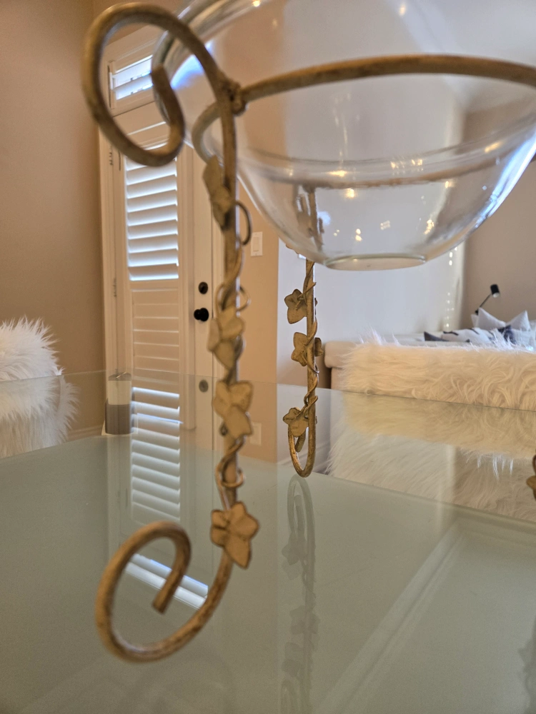 The elegant glass bowl can be used as a Candle holder, Fruit Bowl, Candy 🍬 Bowl or just a decorative bowl. Features a decorative metal stand with golden leaf accents. Perfect for home decor.