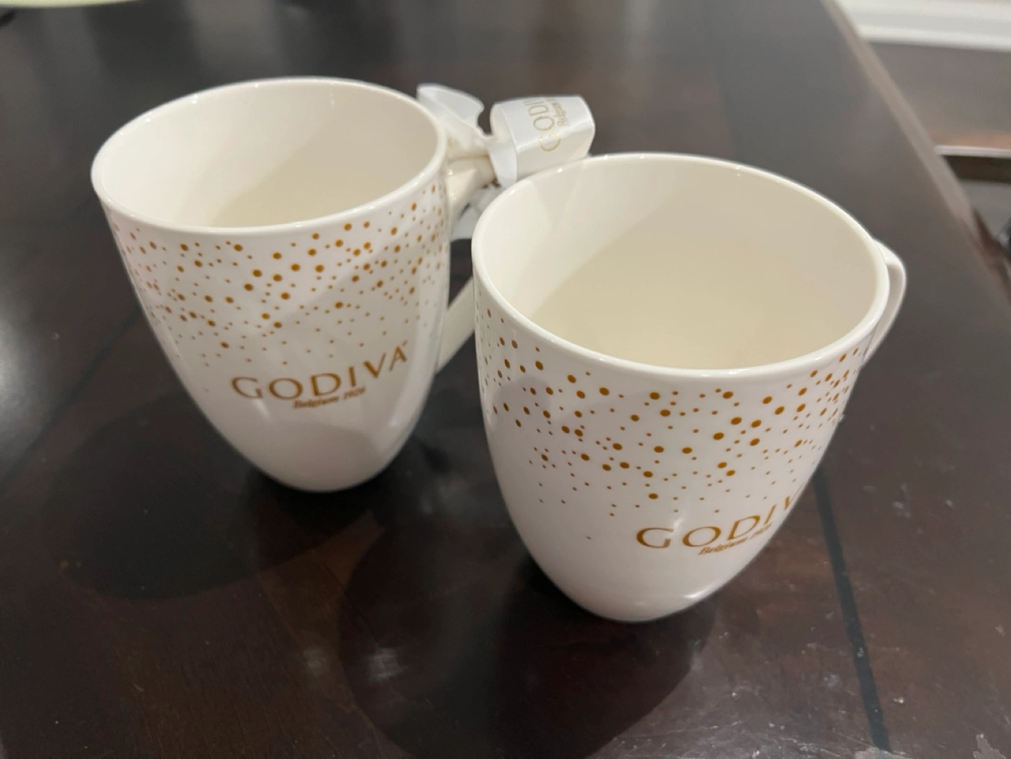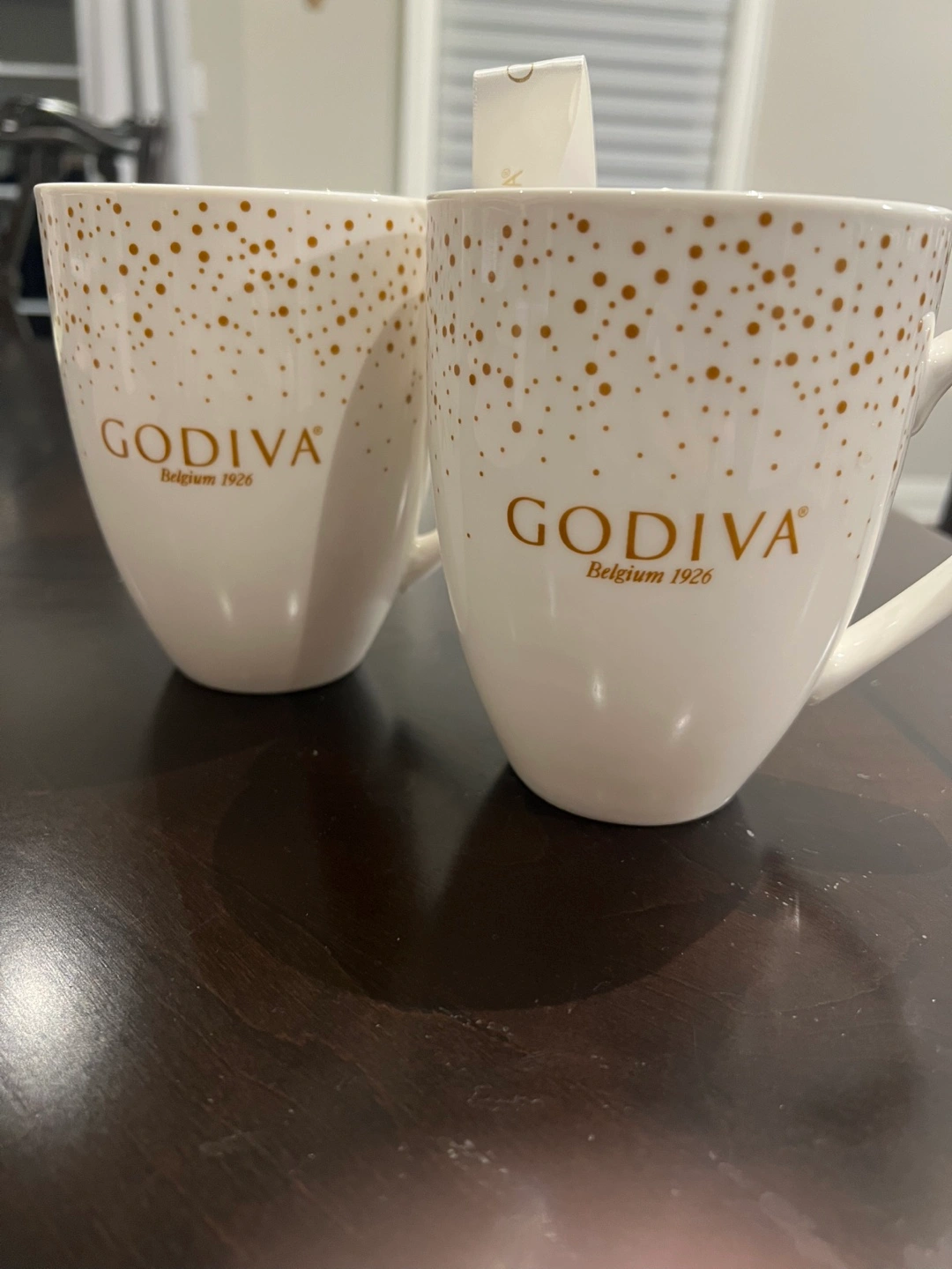 Large 2 Godiva mugs. White with gold specks and logo.