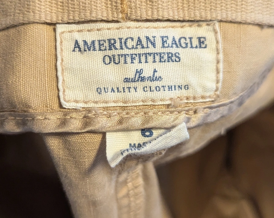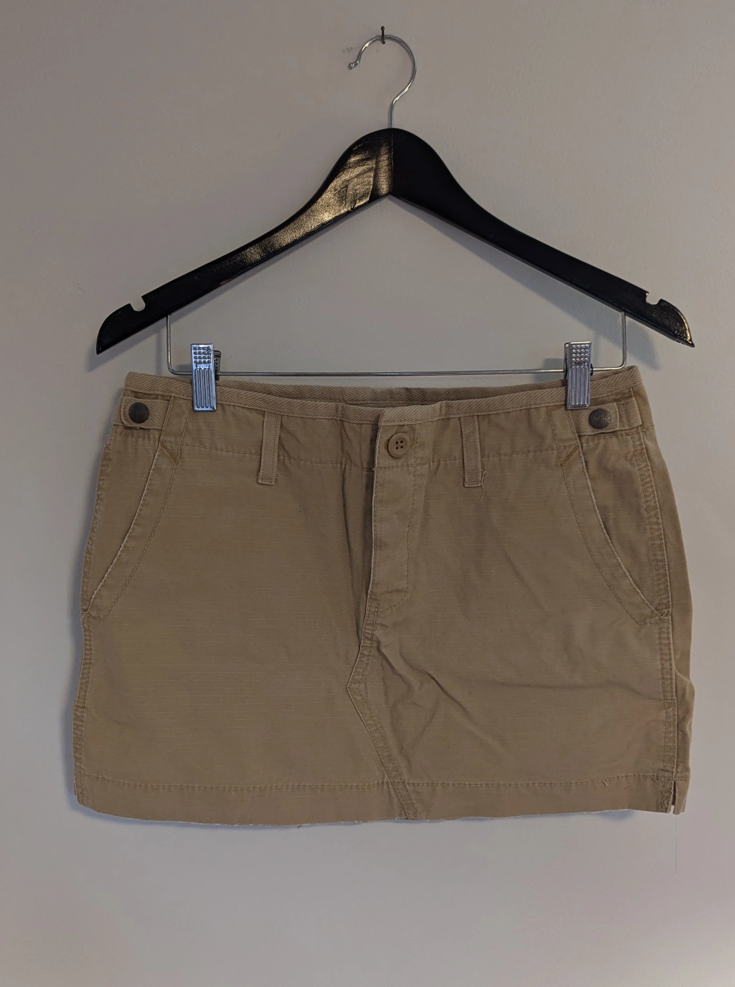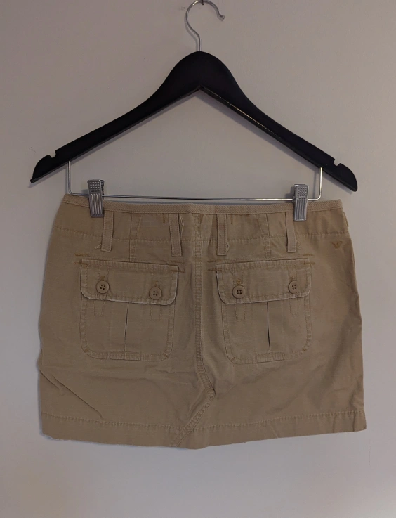Women's mini skirt. Khaki colour. Two front pockets and two back pockets. Button closure. Size 6.