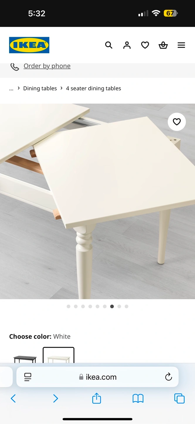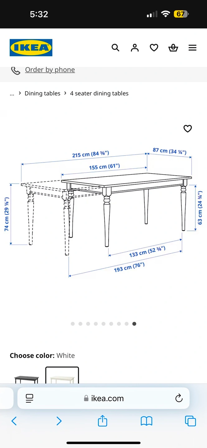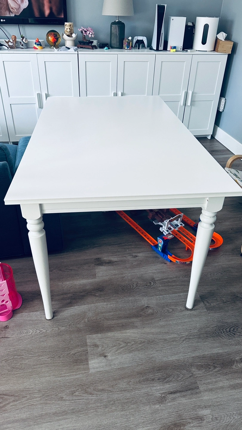 IKEA Ingatorp dining room table with extendable leaf. This 4-seat table can easily be extended into a 6-seat table using the included self-storing leaf. Measurements Length: 155 cm (61 ") Max. length: 215 cm (84 5/8 ") Width: 87 cm (34 1/4 ") Height: 74 cm (29 1/8 ") Selling for 200.00 obo Pick up in Milton or meet in Mississauga
