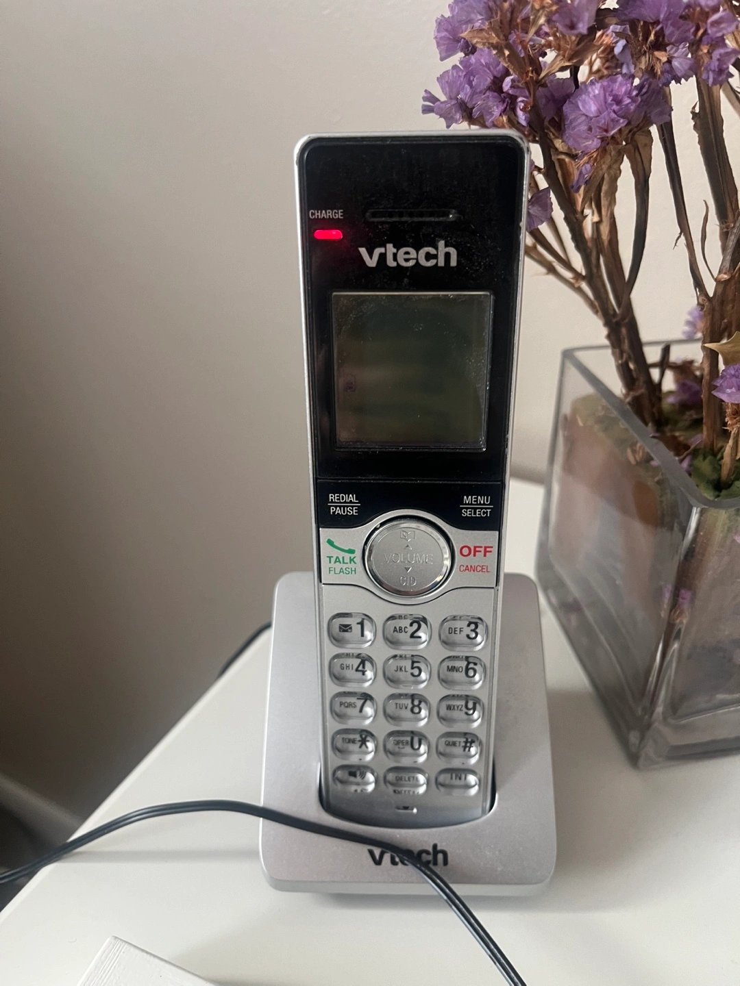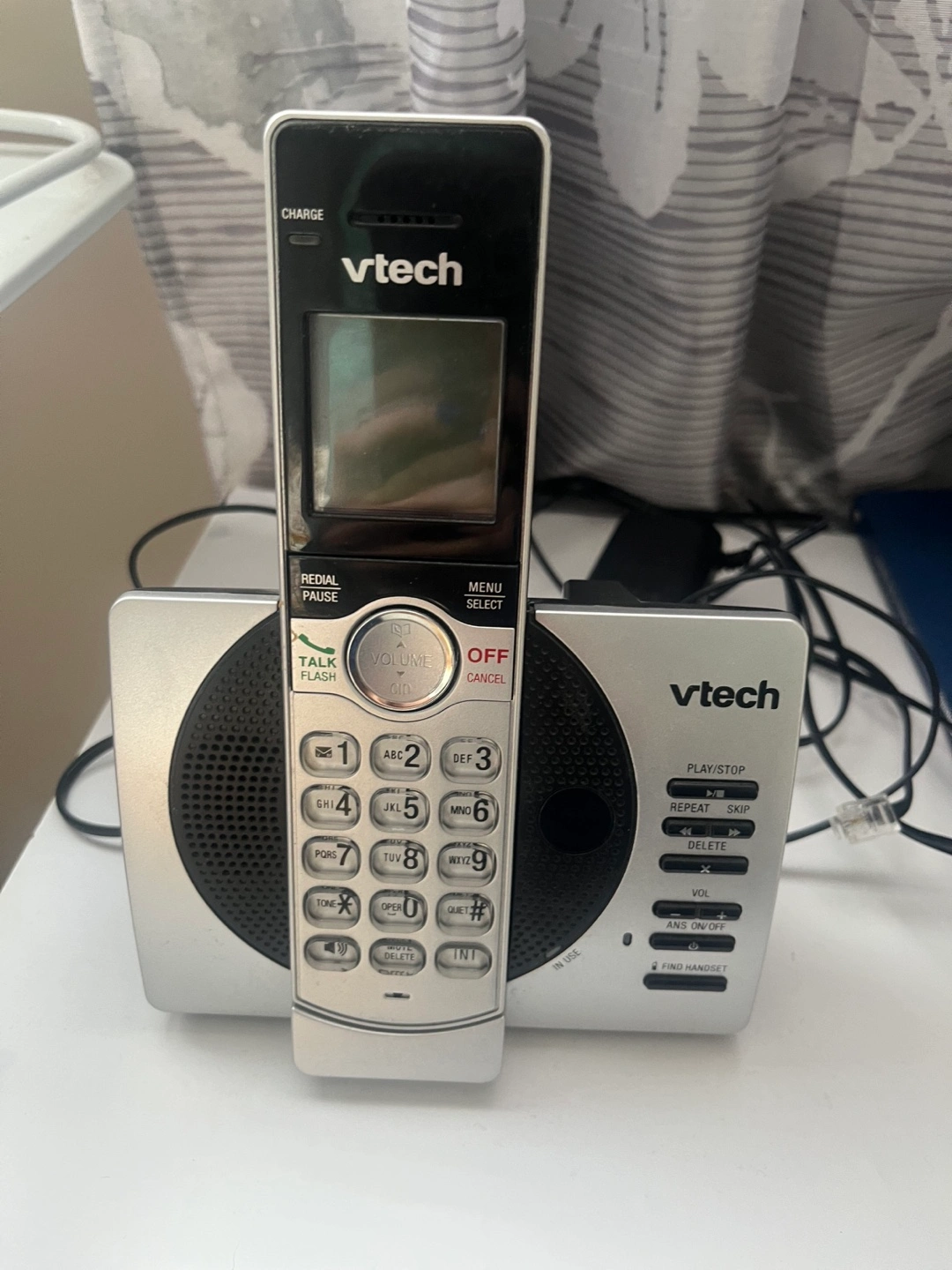 Silver cordless phone. Large I display screen. Includes answering machine features. Used but in good condition.