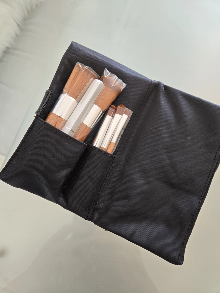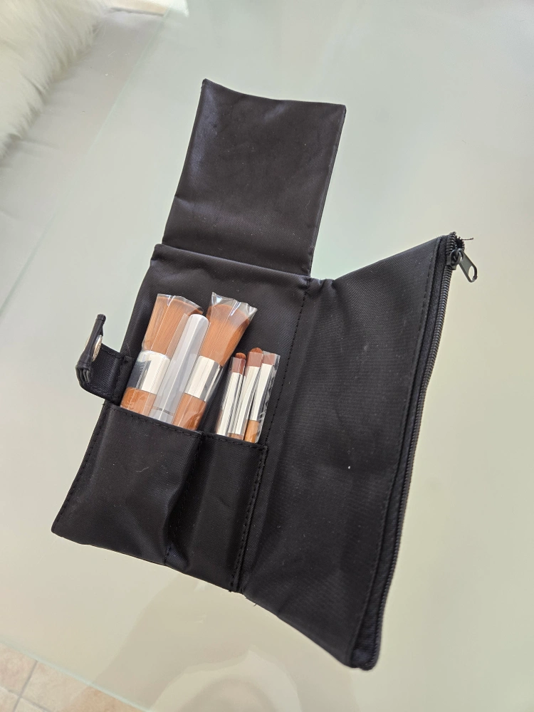 Black nylon travel case. Contains several makeup brushes with wooden handles. Perfect for travel or everyday use.