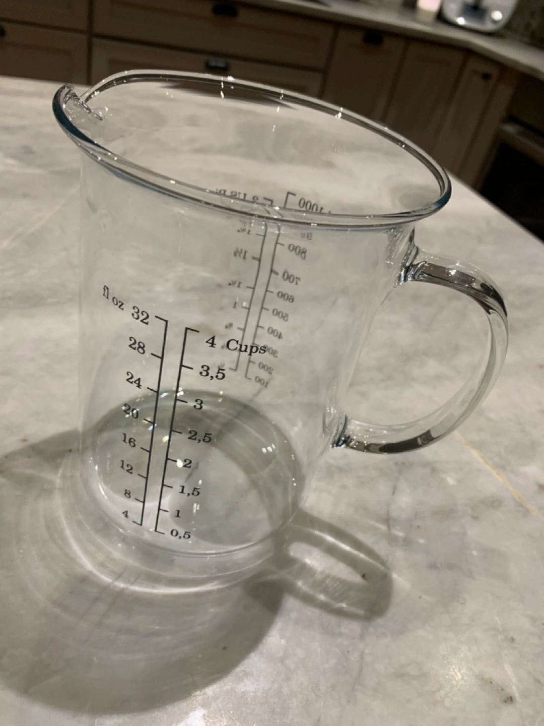 Clear glass measuring jug. Features a handle and measurements in both fluid ounces and cups. Suitable for various kitchen uses.