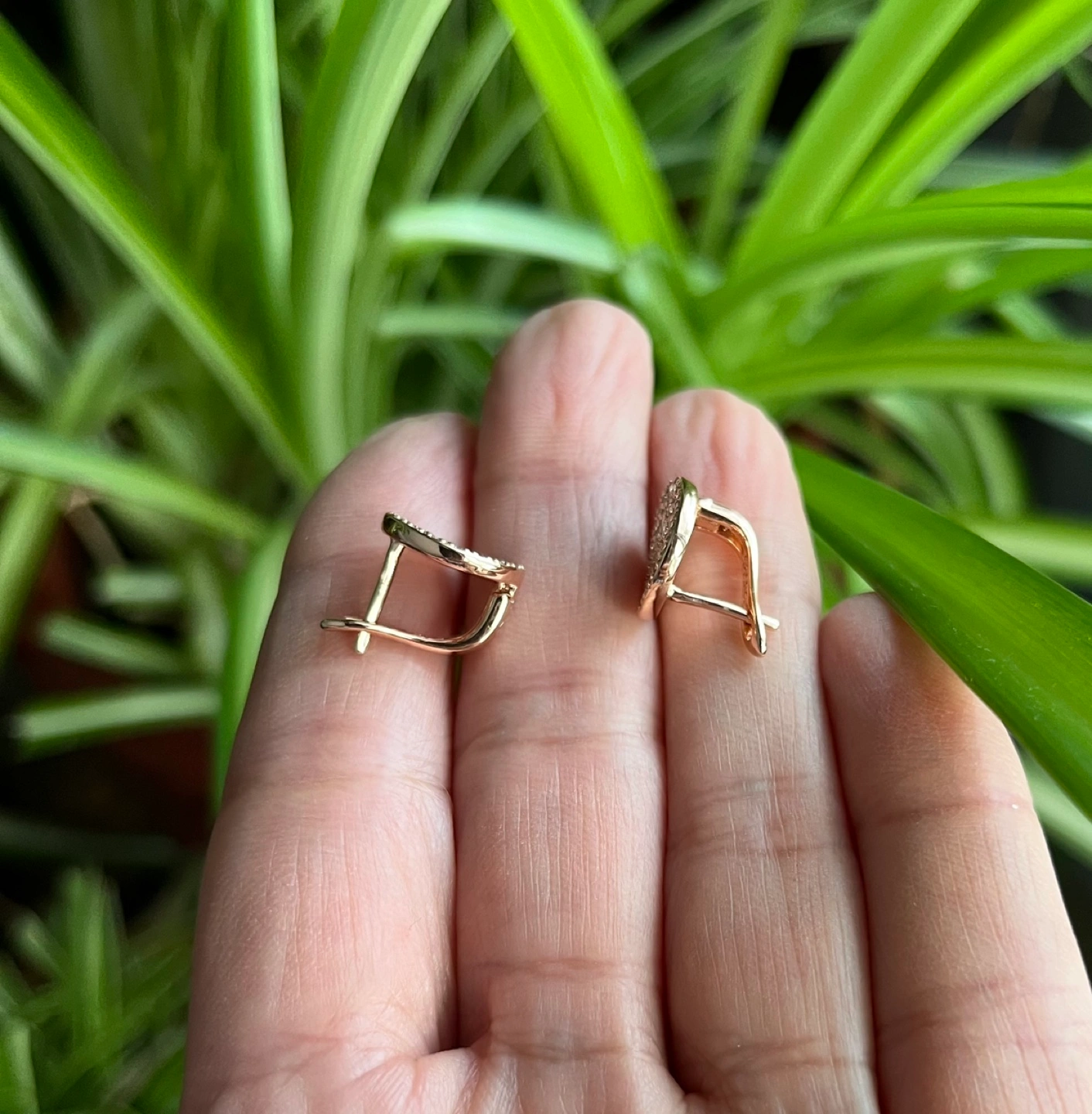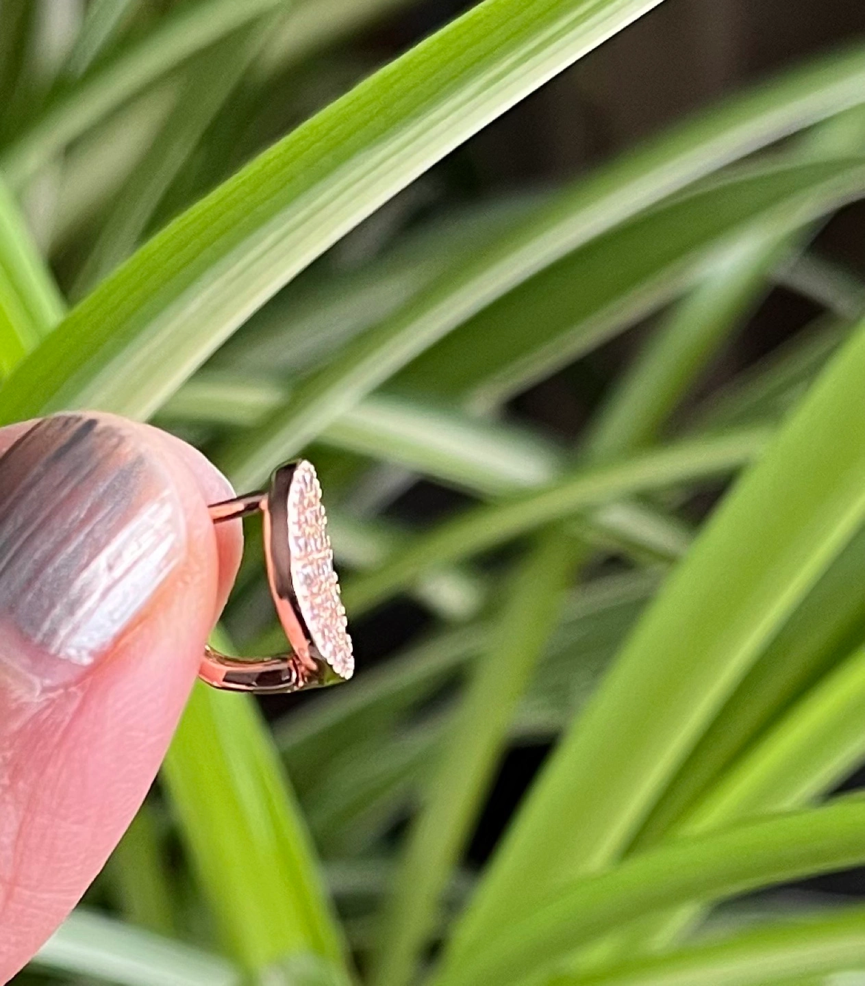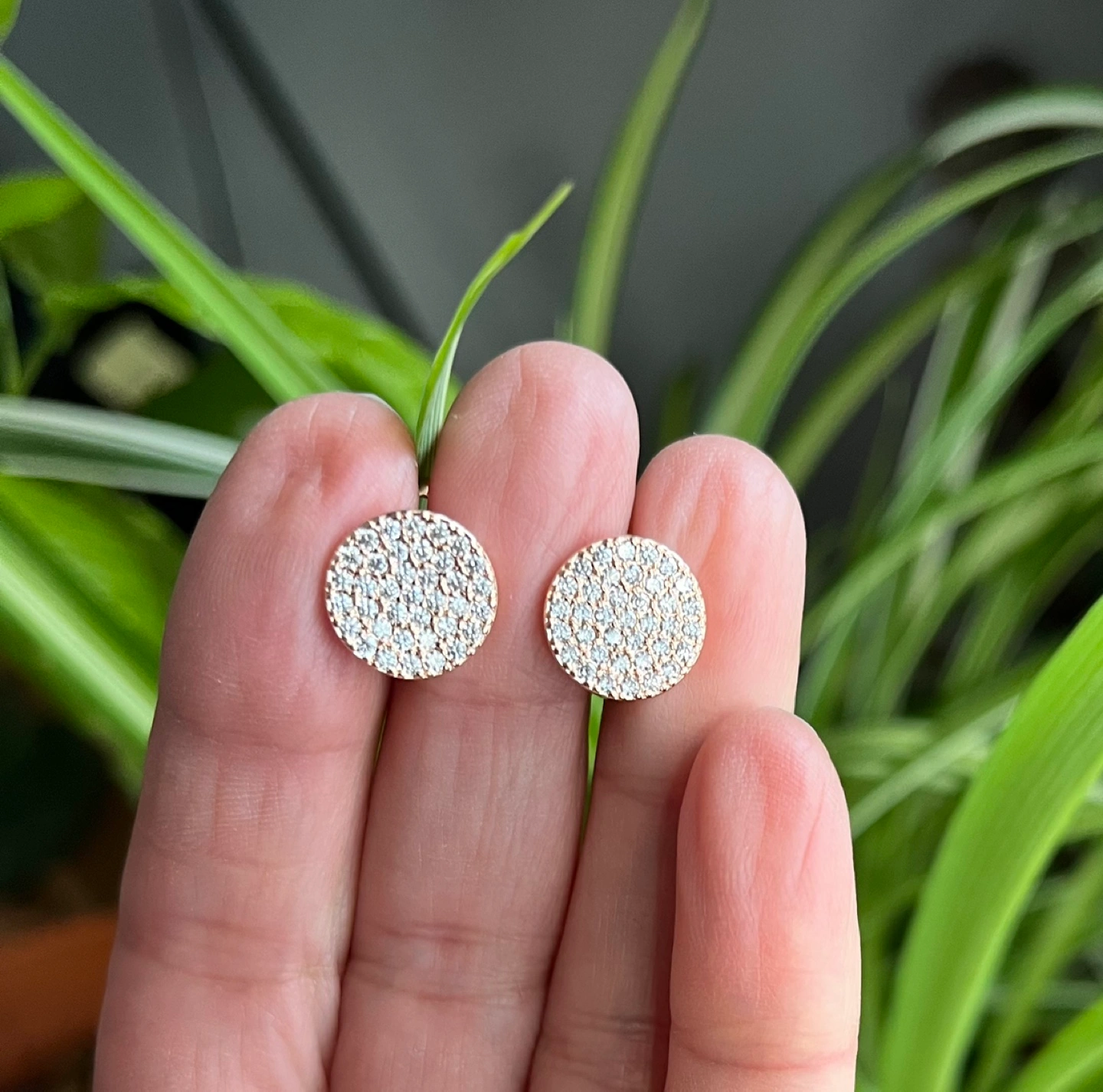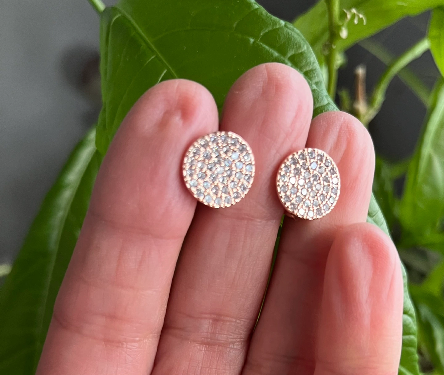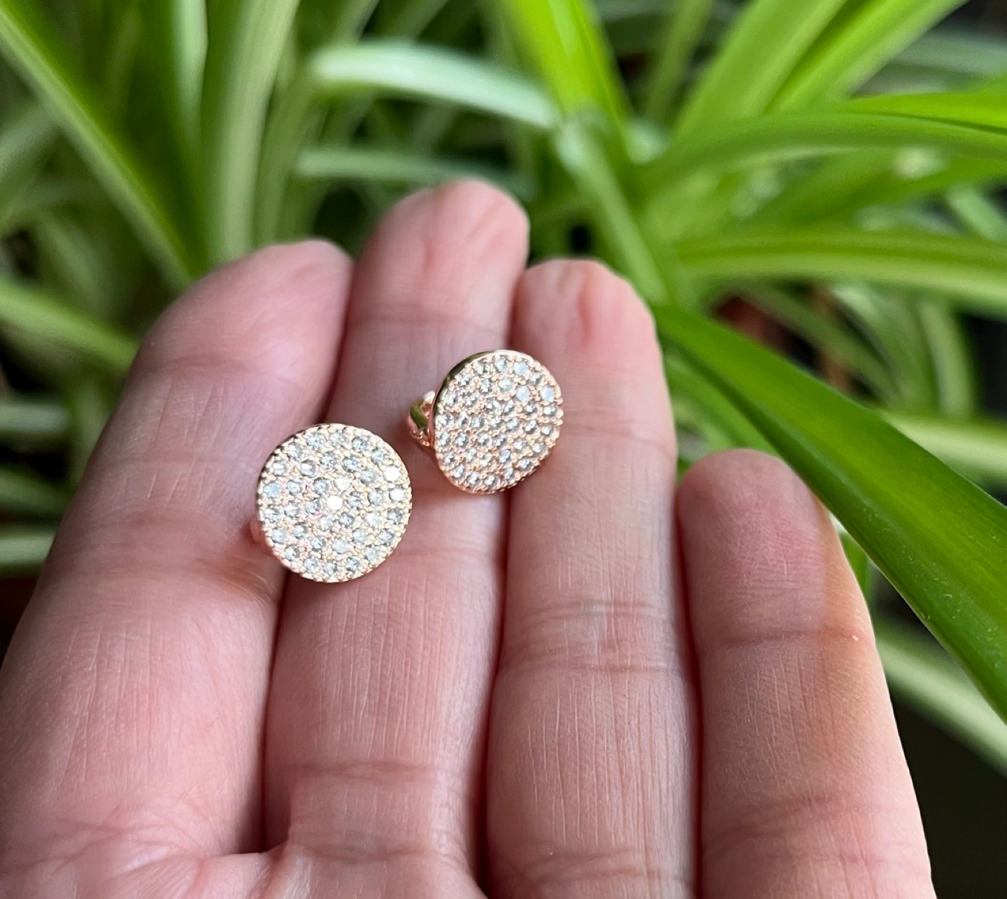 Stunning rose gold earrings. Feature pave-set cubic zirconia stones. Round disc design. Secure leverback closure. Elegant and sparkly.