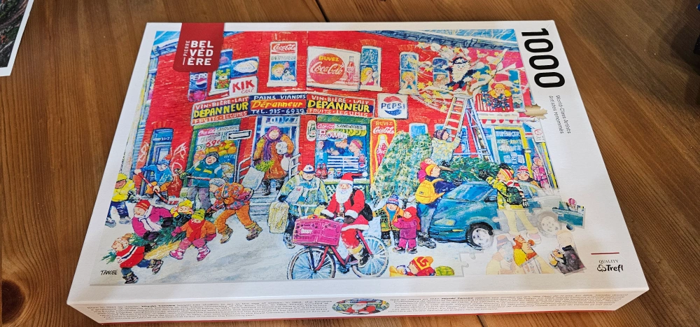 1000-piece jigsaw puzzle. Features a vibrant Christmas scene, likely in Quebec. Depicts a bustling street with shops, people, and Santa Claus. Like new.