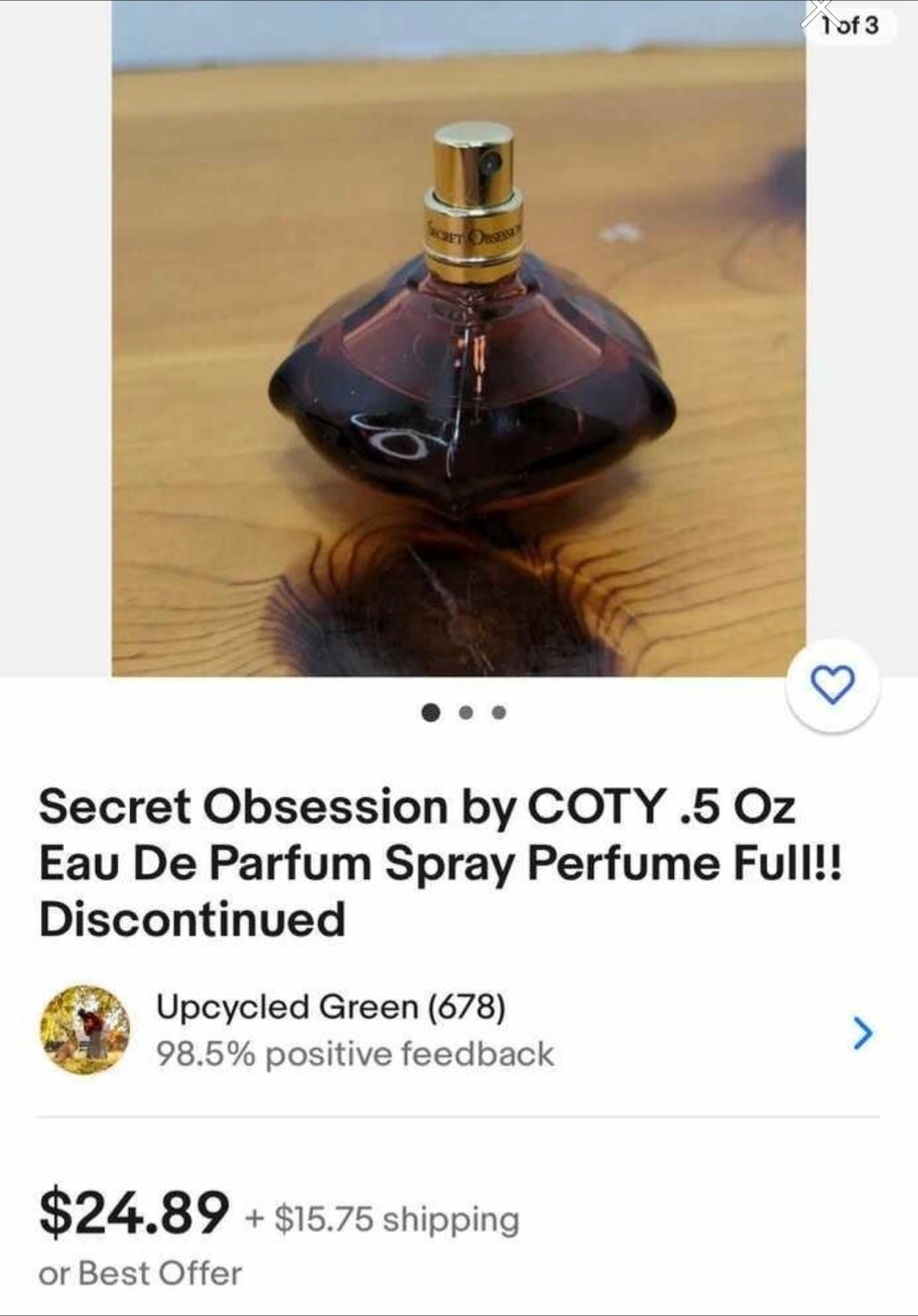 EUC $14 Secret Obsession by Coty. 15ml (Almost full). $20 Vintage Jean Nate Bath and Body perfume A spray of Nate. 1oz (Half full). Information is shown in the pictures. Last 2 pictures are for price reference only. Cross posted.