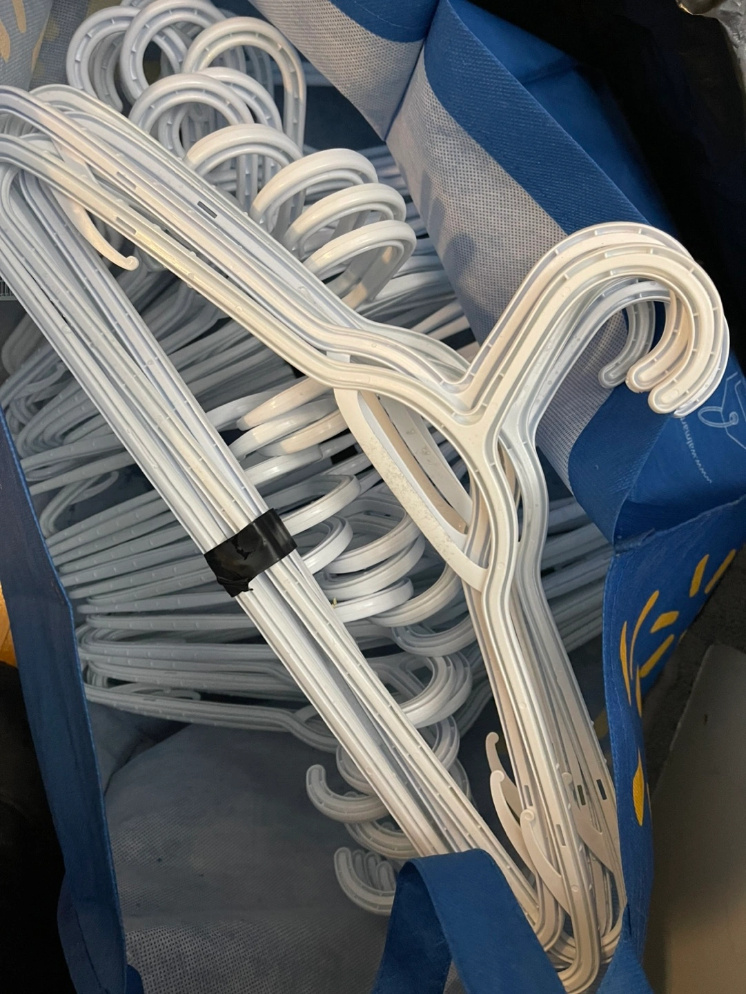 A large quantity of white plastic clothes hangers. Great for organizing closets or for resale. Sold as a bundle.